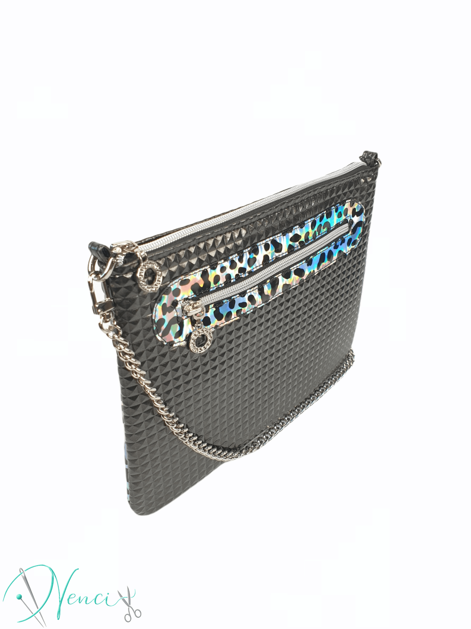 Außen siehst du schwarzes Nieten-Kunstleder und unten das neue bedruckte-LEO- Kunstleder von Lieblingsnadel in einem silbrigen Ton, welcher je nach Lichteinfall in Regenbogenfarben schillert (limitiert). Hinten ist Casey aus dem gleichen schwarzen Nieten-Kunstleder wie auch vorne.