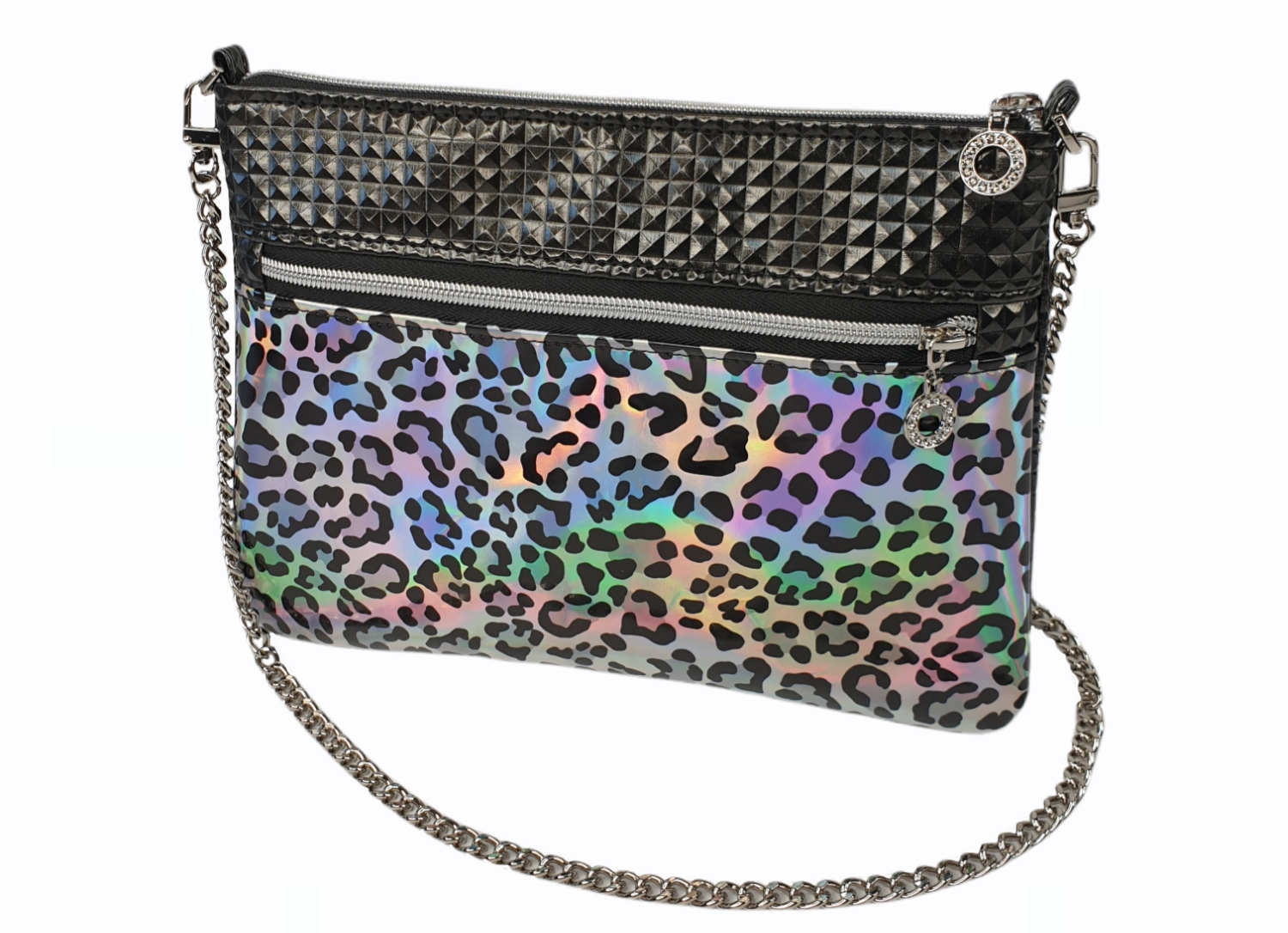 Alle Reißverschlüsse sind in silber gehalten, auch die glitzernden runden Zipper sind im gleichen Ton, sowie die stylische Taschenkette, die zum Angebot dazu gehört.