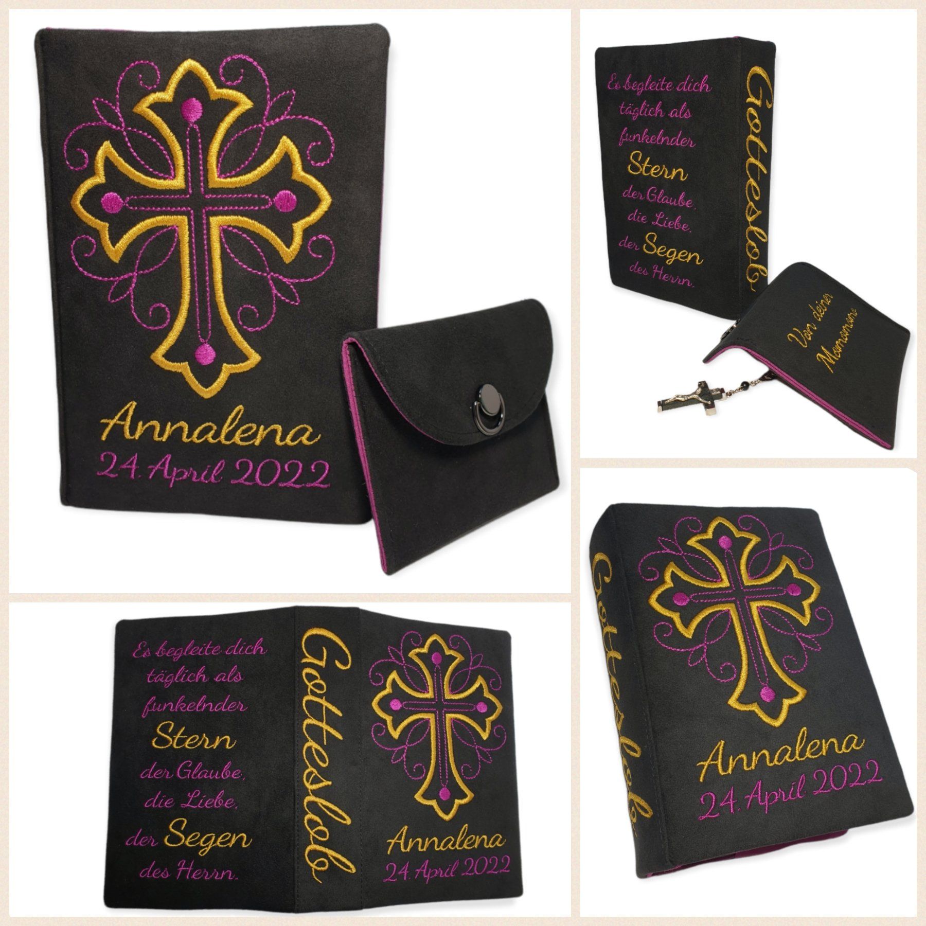 Bestell dir gerne ein kleines (ca. 8cm x 10cm) Täschchen aus dem gleichen Material für den Rosenkranz dazu.