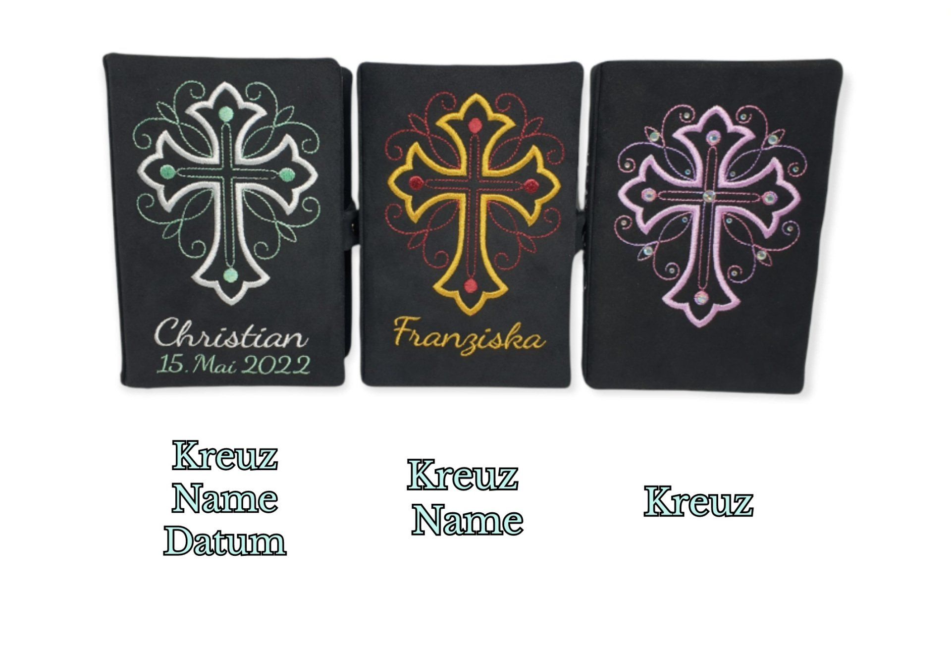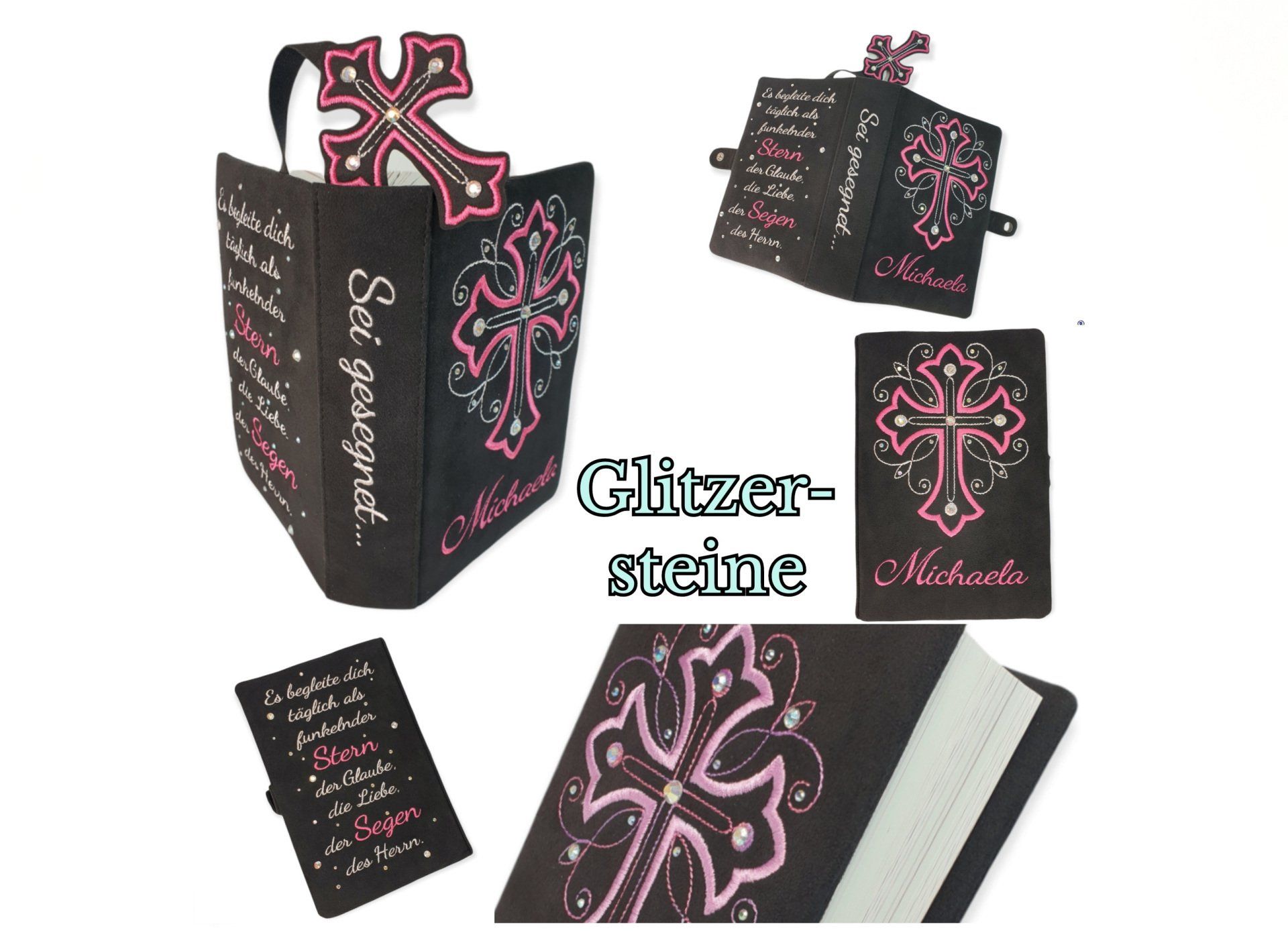 Auf dem Kreuz und wenn du den Spruch auf der Buchrückseite ausgewählt hast bzw. das Lesezeichen, werden große und kleine Glitzersteine angebracht.
