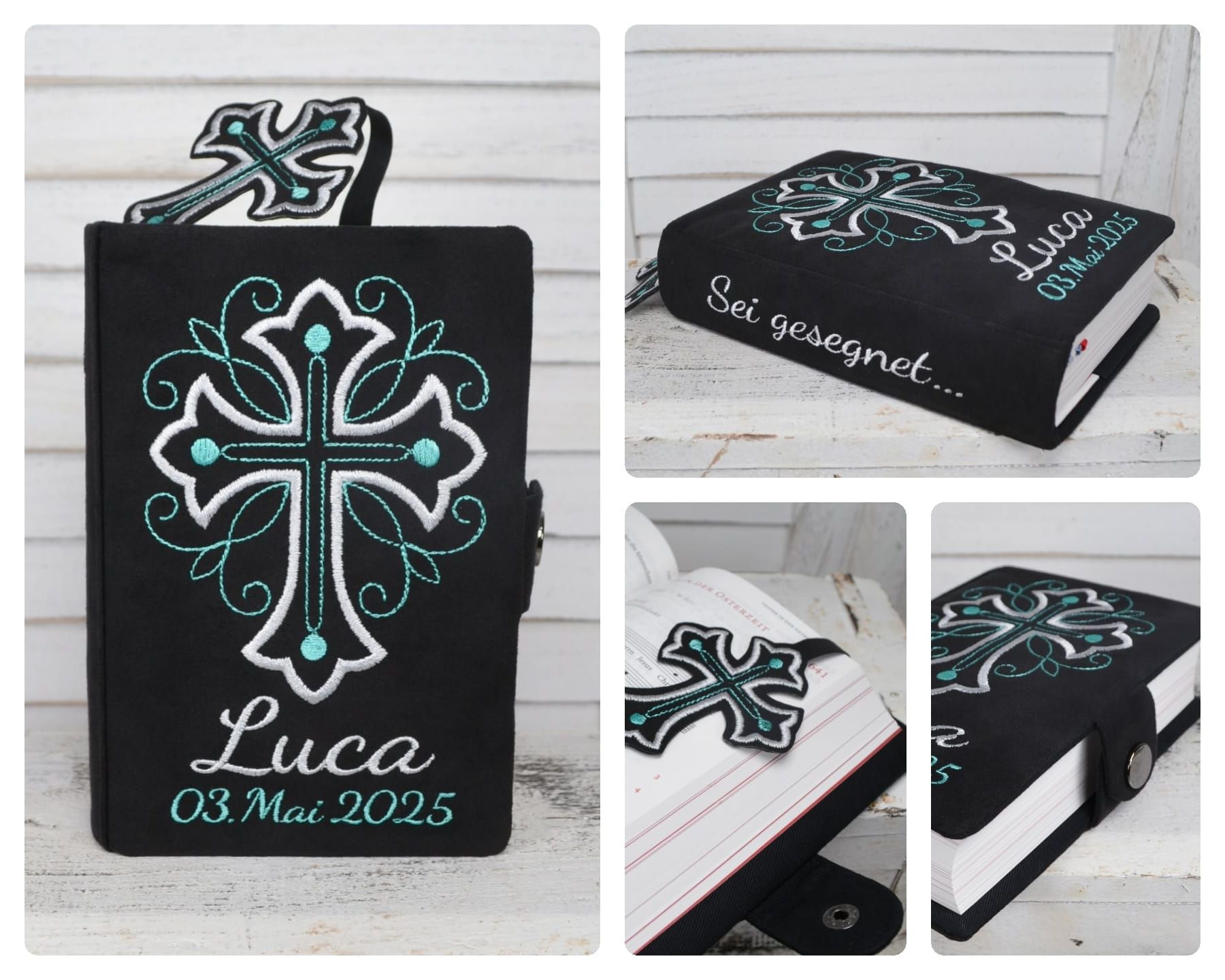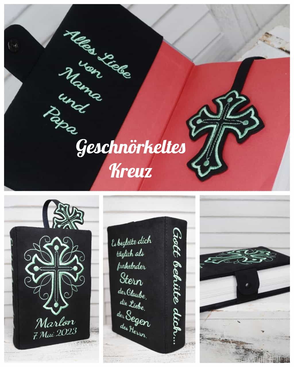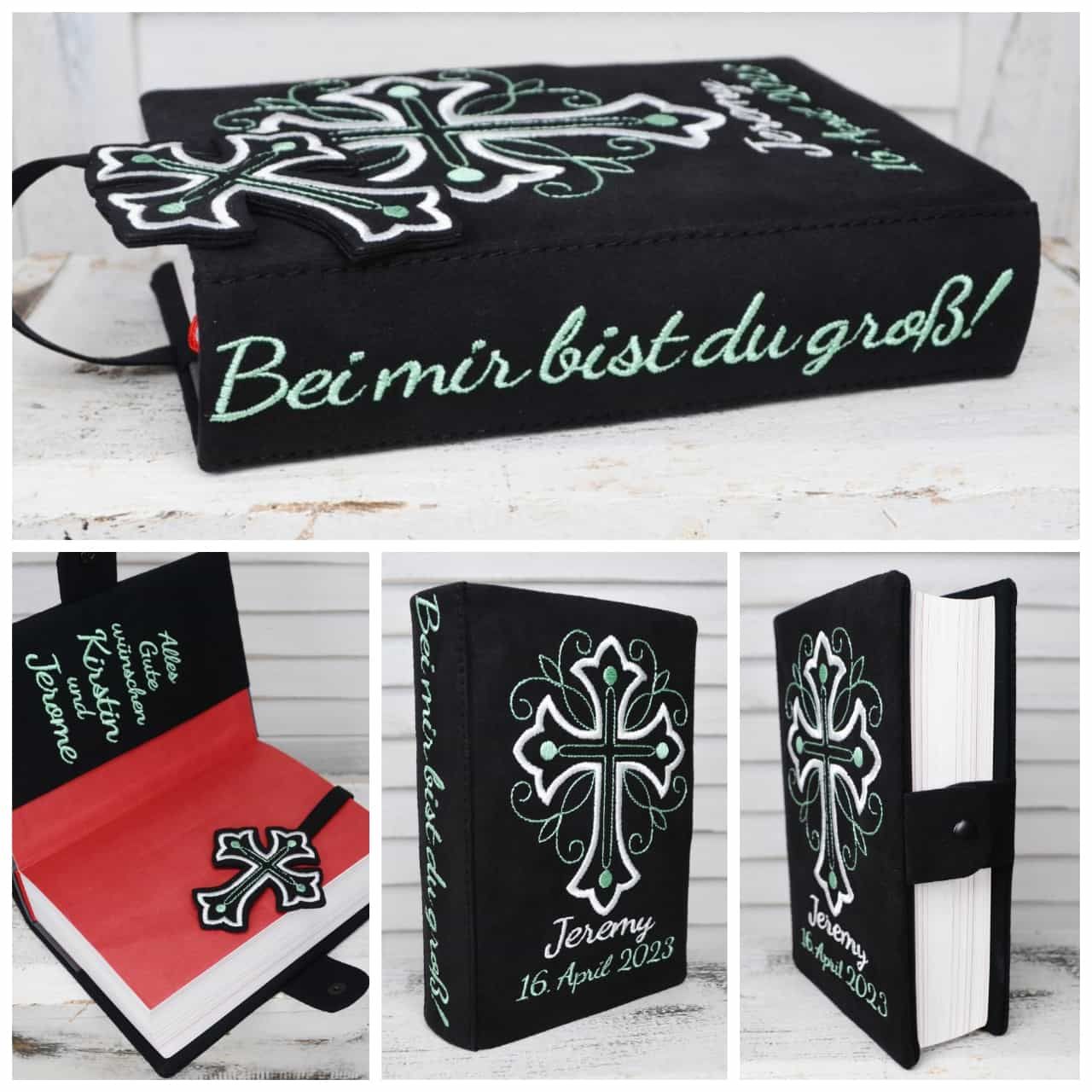 Hierfür sticke ich die kleinere Variante des Kreuzes vom Buchdeckel und nähe es mit einem Band an die Hülle, so dass es nicht verloren gehen kann.