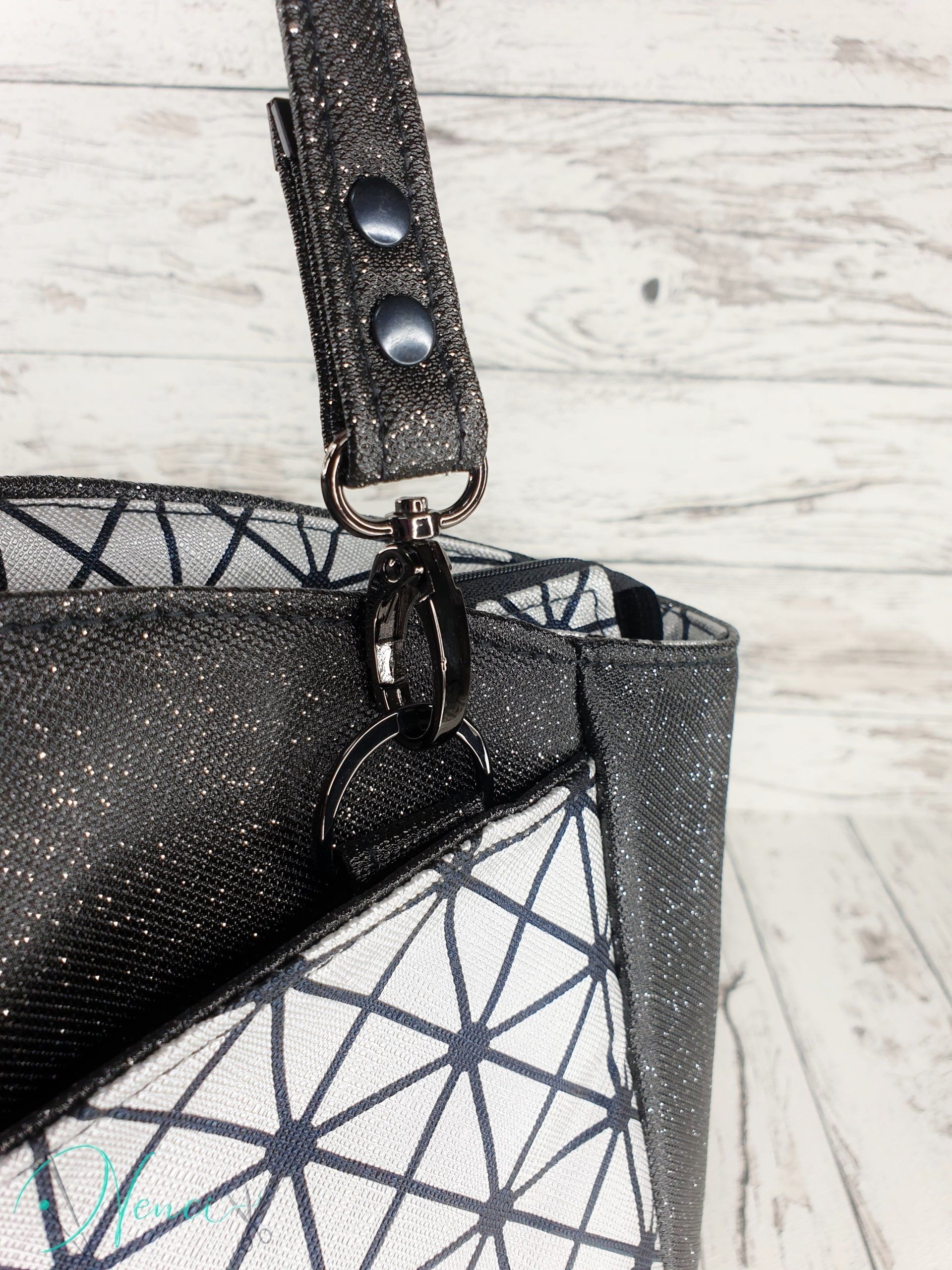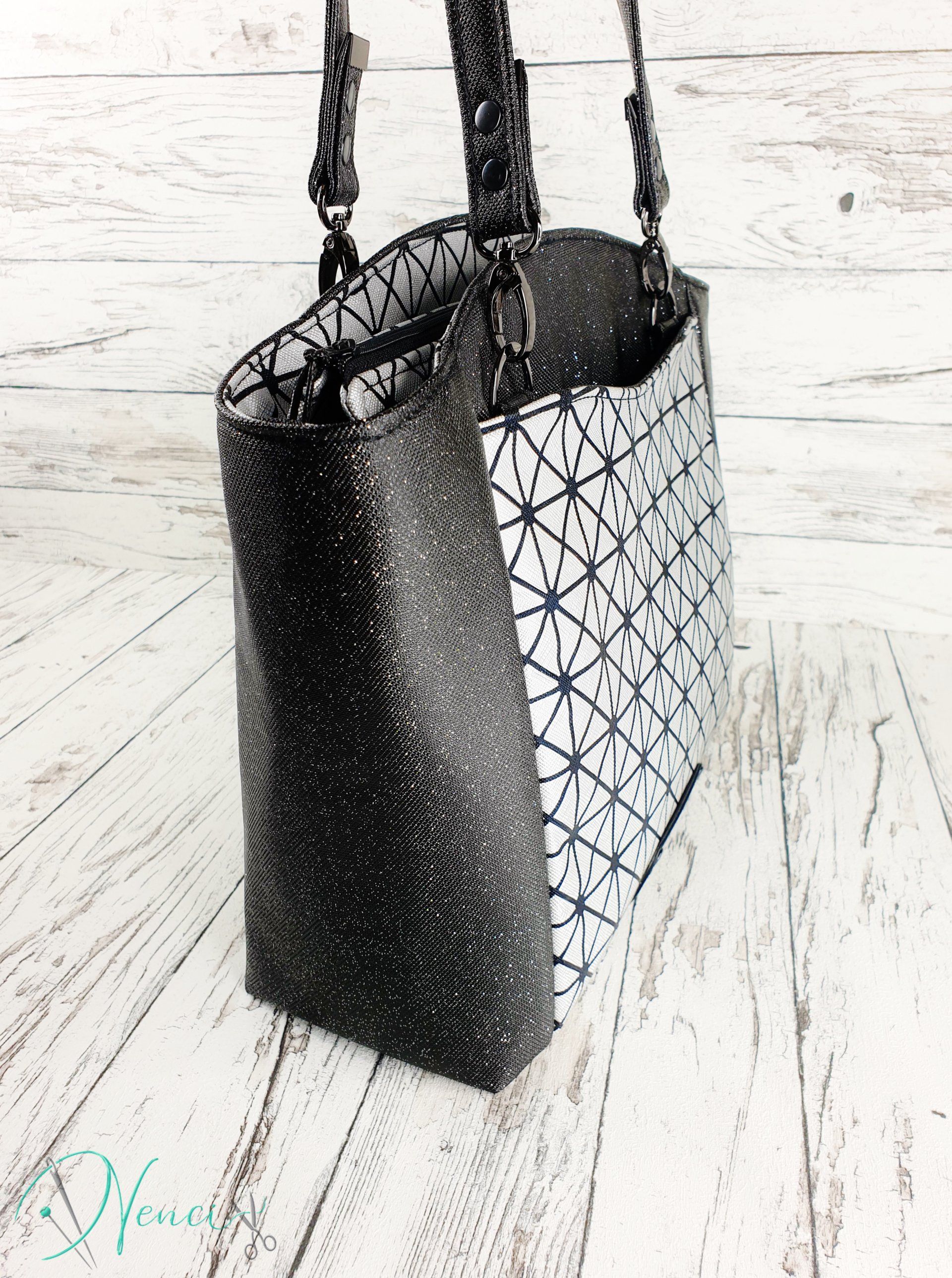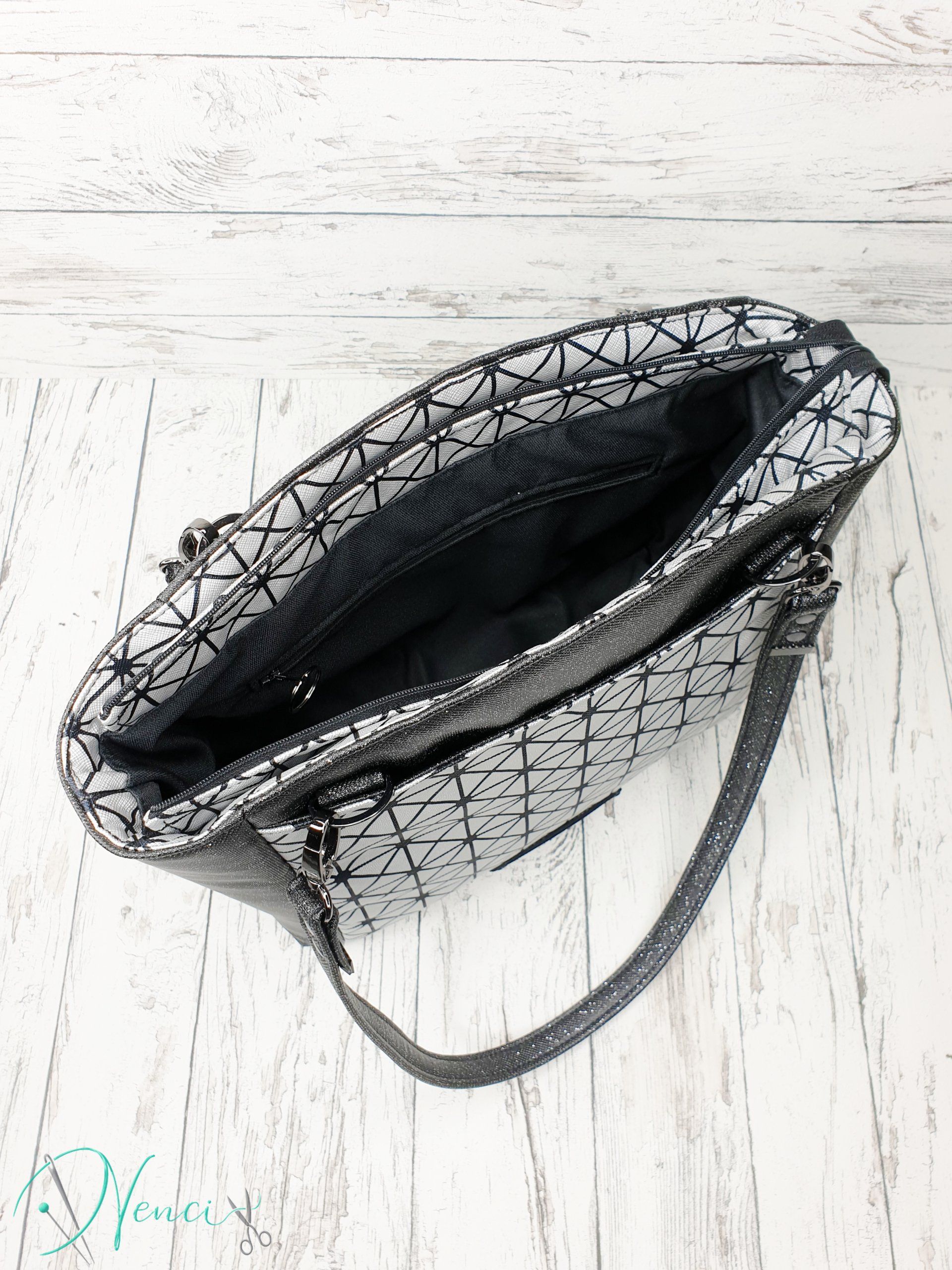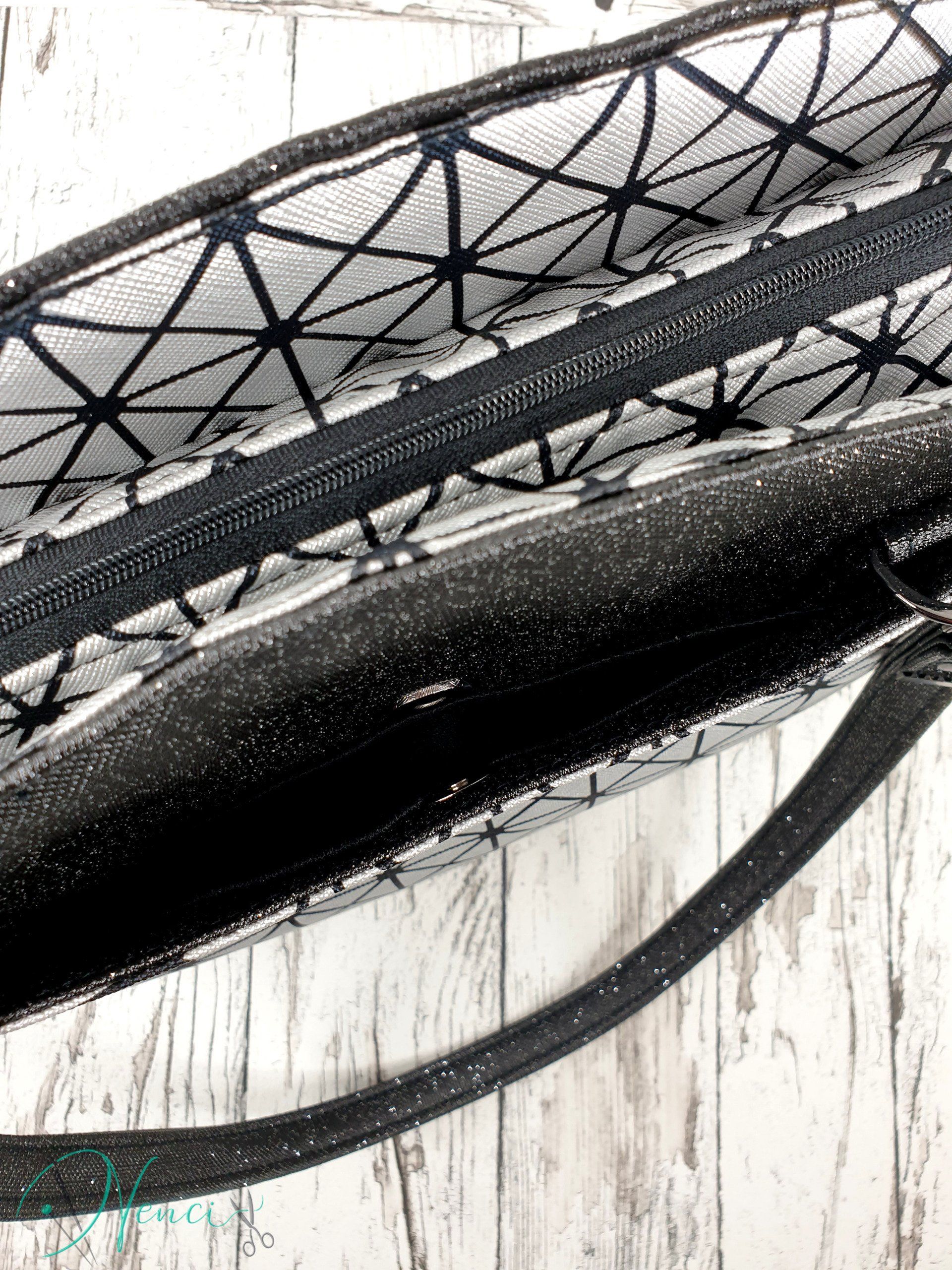 Diese Tasche habe ich aus glitzerndem Kunstleder in Kombination mit Geometrie-Kunstleder in silber genäht.