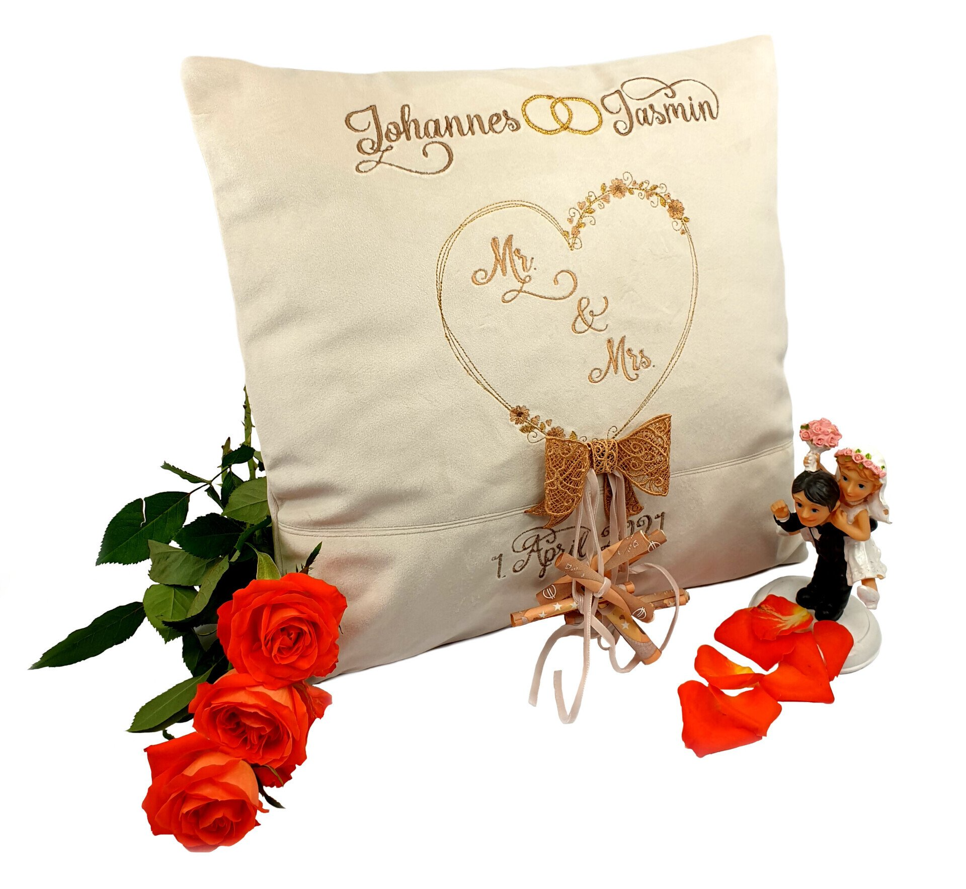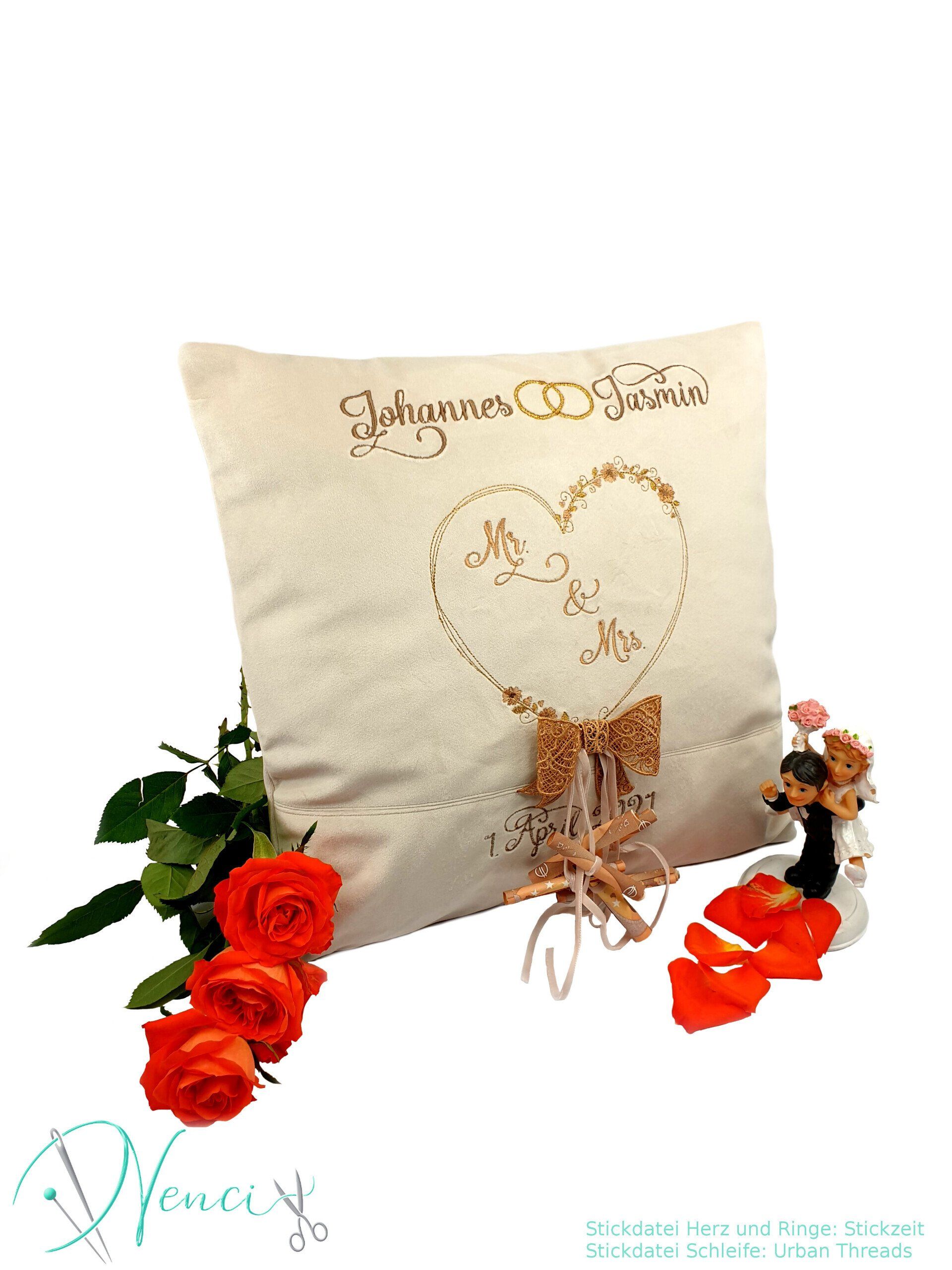 Wenn das Paar also absolut nicht typisch weiß, gold und cremefarben ist, kann ich mit dir gerne ein lustiges oder auch dunkles Kissen entwerfen.