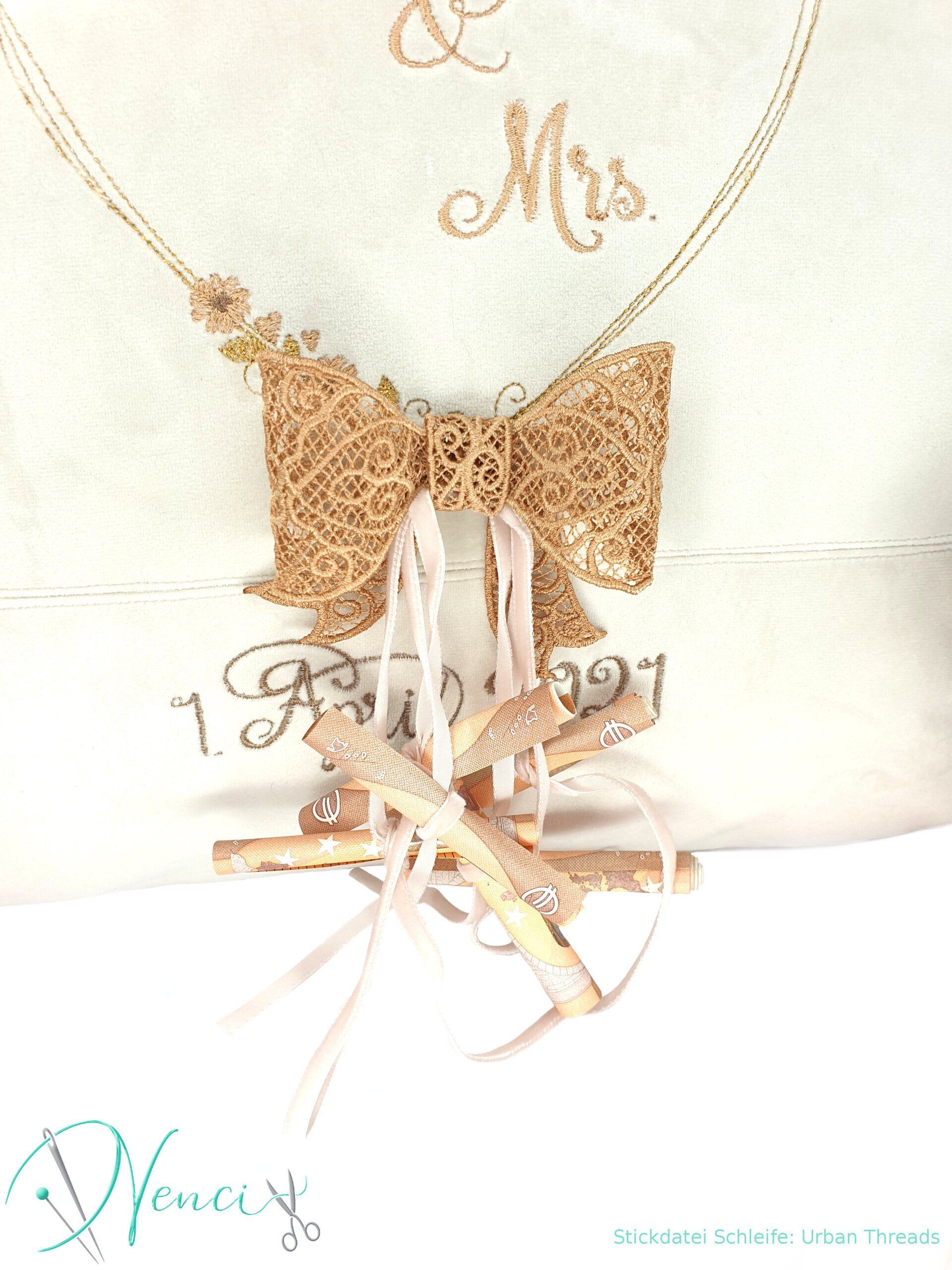 das Hochzeitsdatum und ein schönes Motiv gestickt wird.