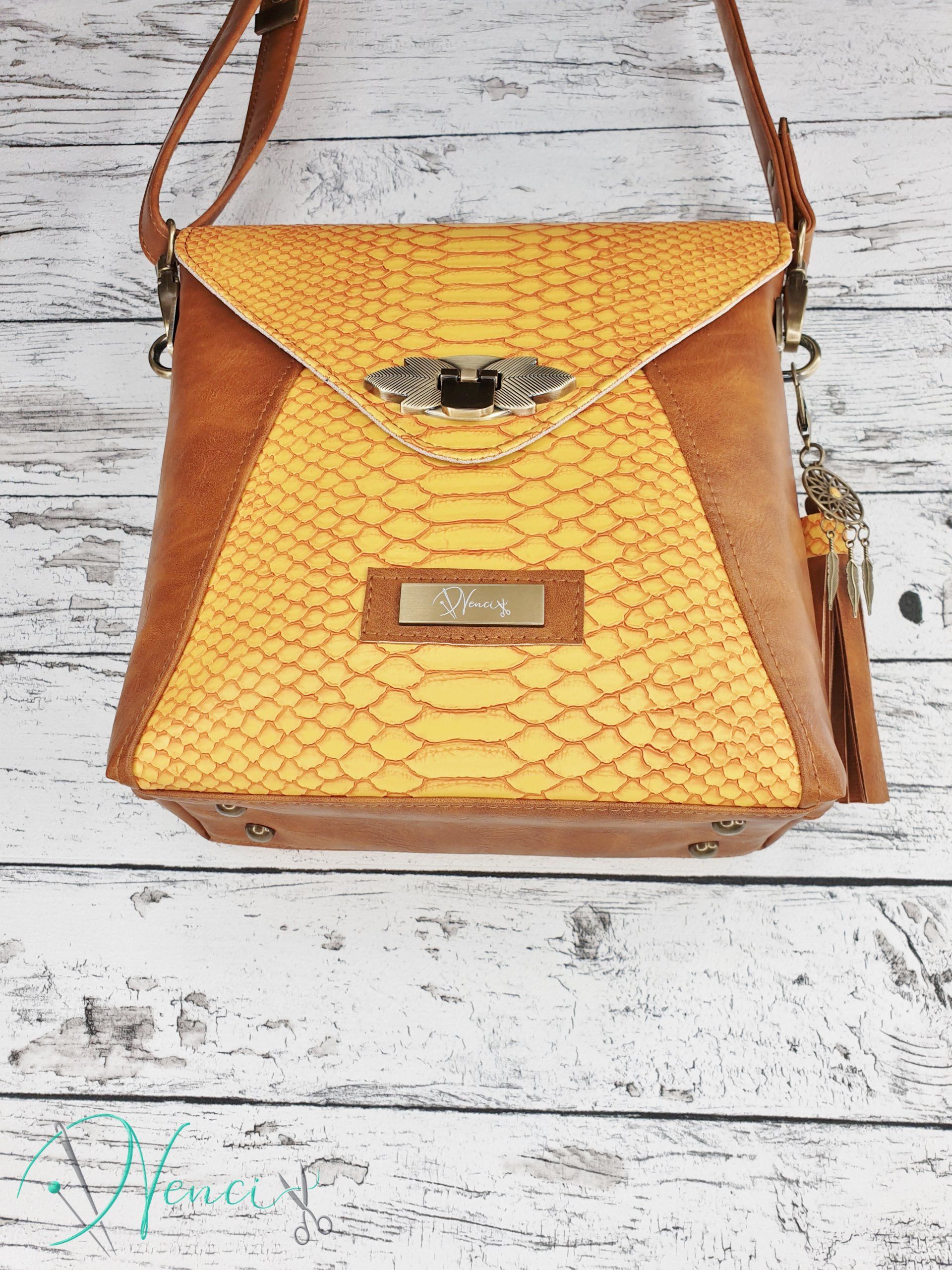 Durch ihre puristische Form bleibt diese Fiorella eher schlicht, doch durch die Kontraste von hochwertigem cognacfarbenen Kunstleder und senffarbenen Schlangenoptik-Kunstleder (gibt es auch nicht mehr zu kaufen!) ist sie doch ein Hingucker.