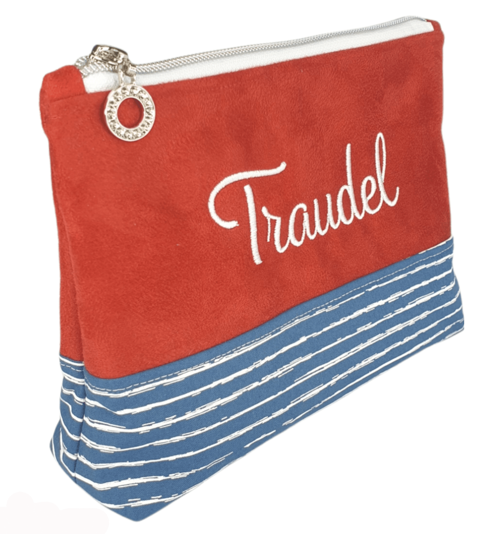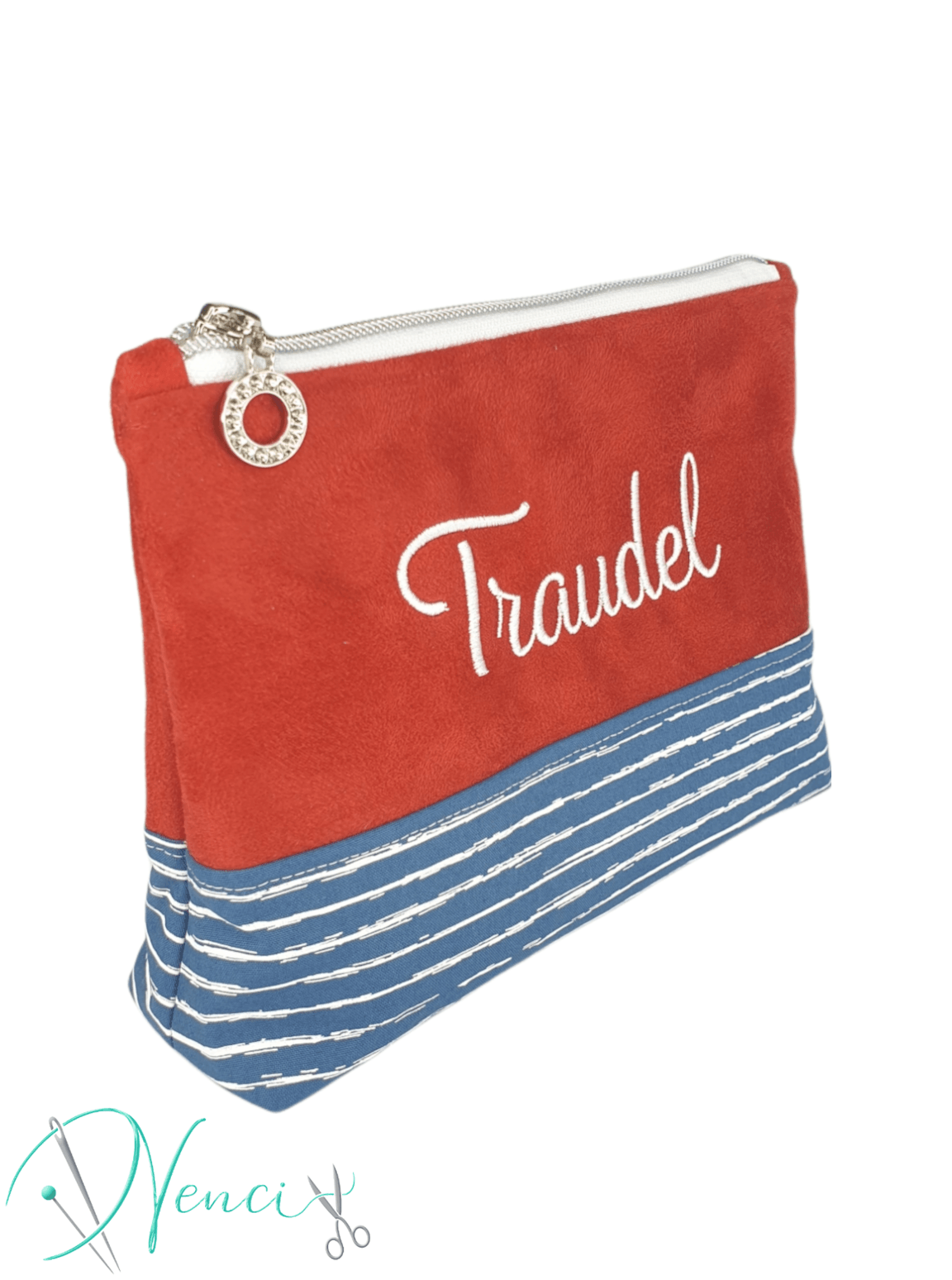 Auf die Front kann der Name und/oder ein Motiv gestickt werden, ich habe viele Effektstoffe, das Täschchen kann aus Baumwollstoff oder/und Kunstleder genäht werden, such dir einen tollen Zipper raus, und und, und....