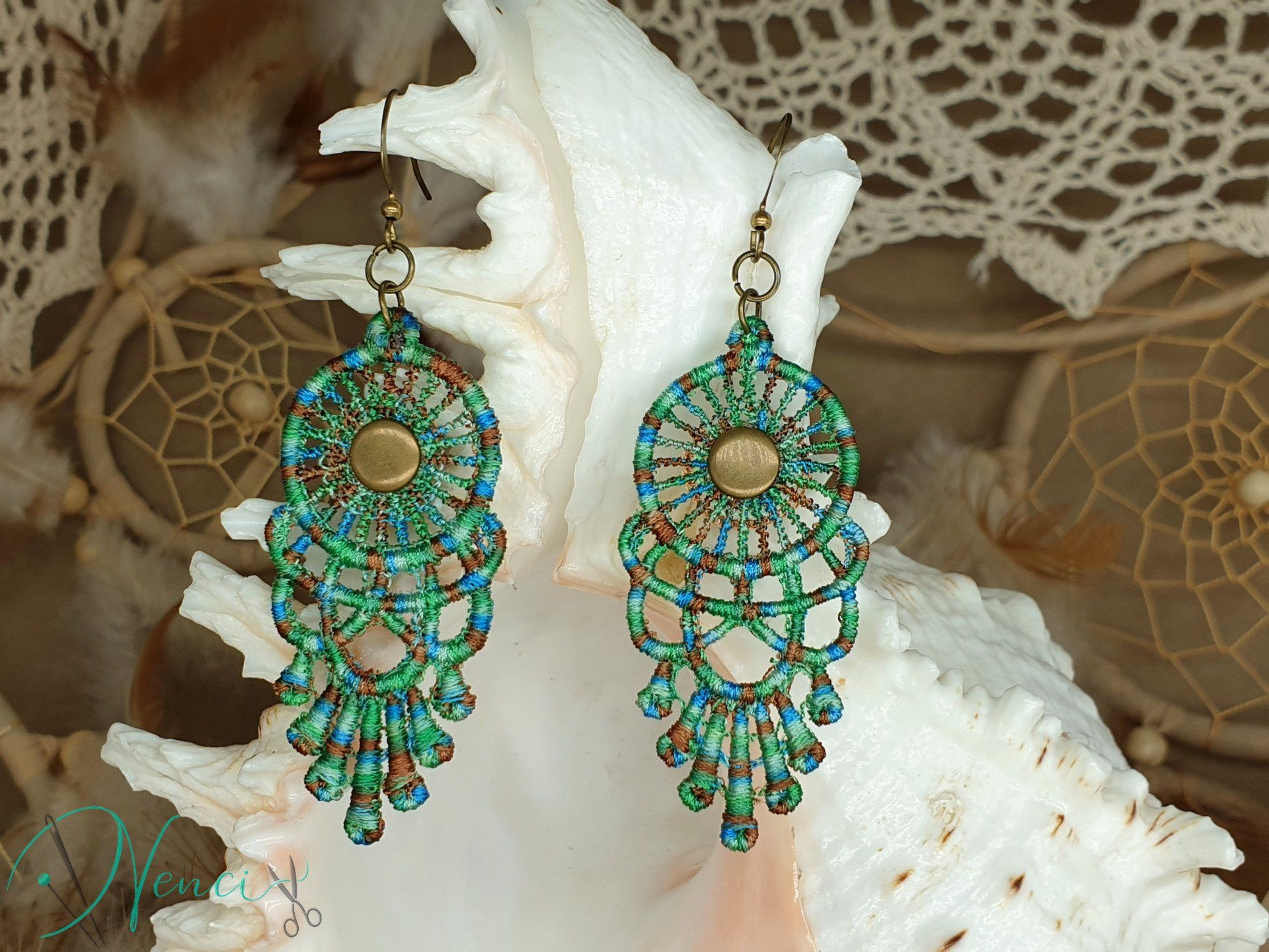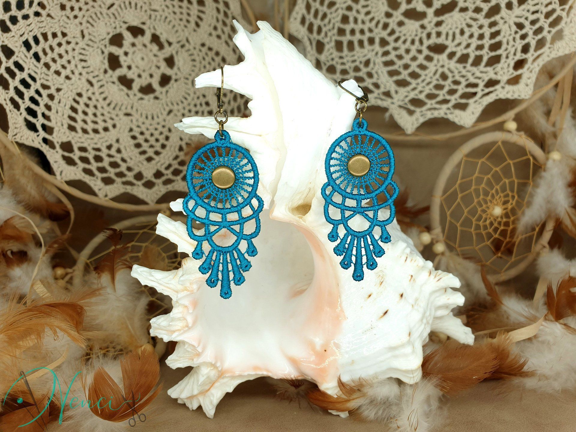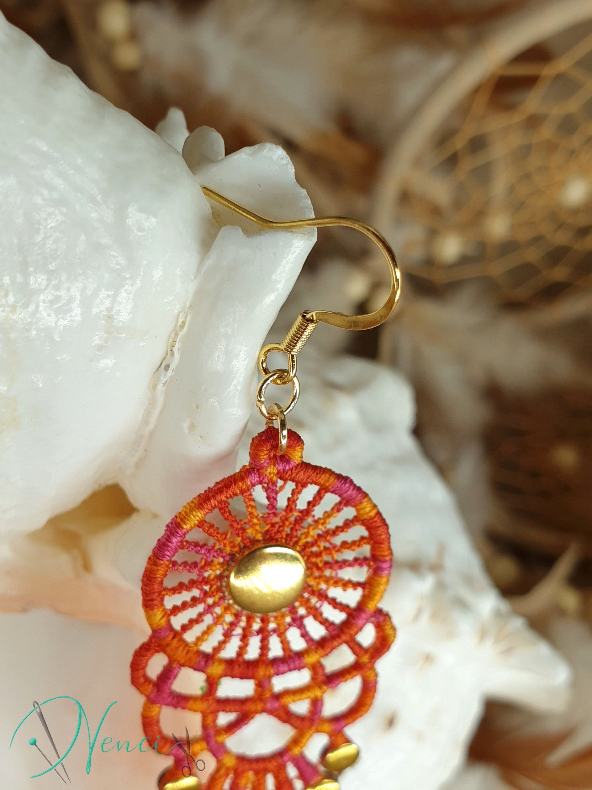 Diese filigranen Ohrringe sind im Free-Standing-Lace-Verfahren mit hochwertigem Polyestergarn gestickt,
