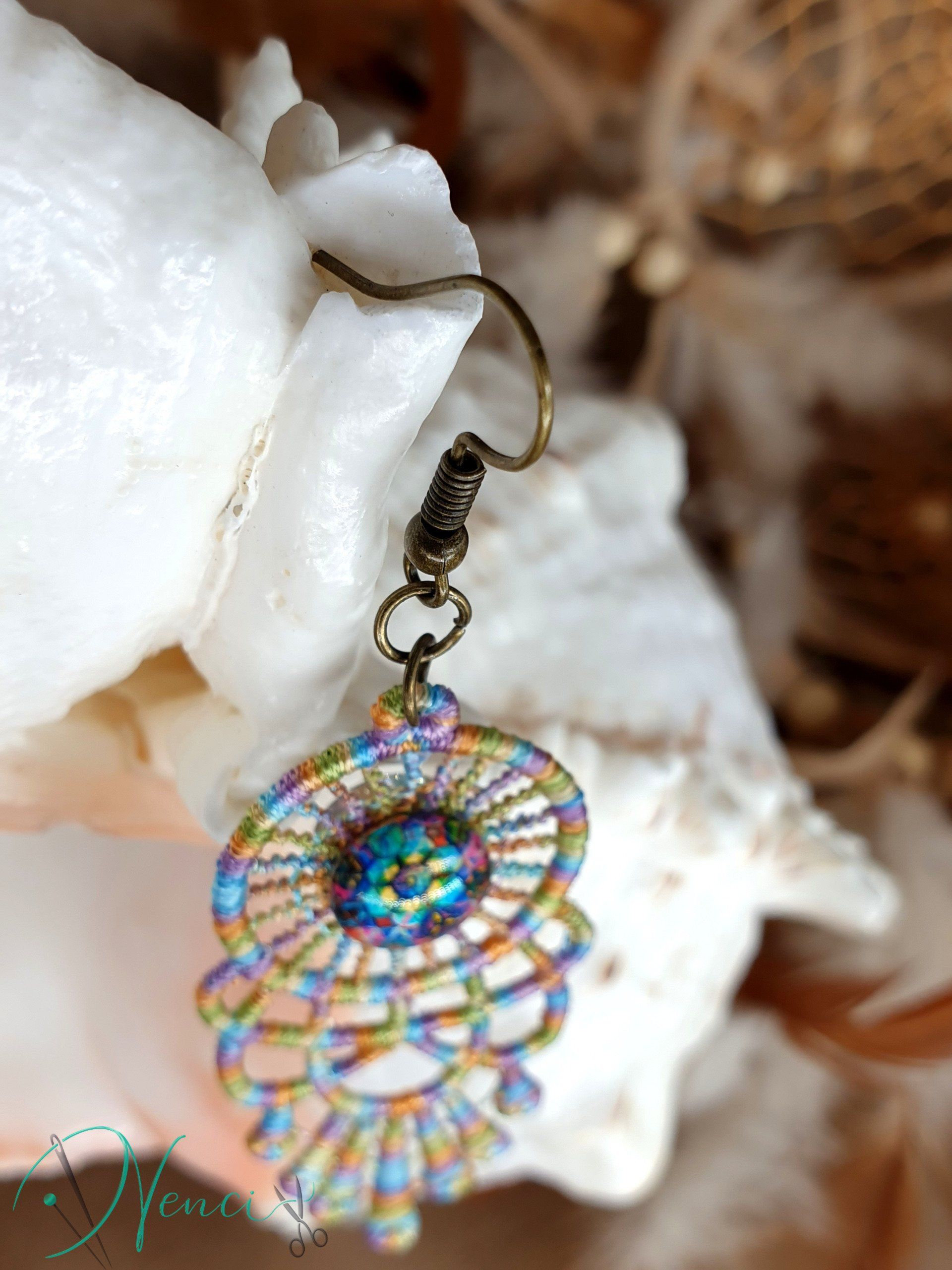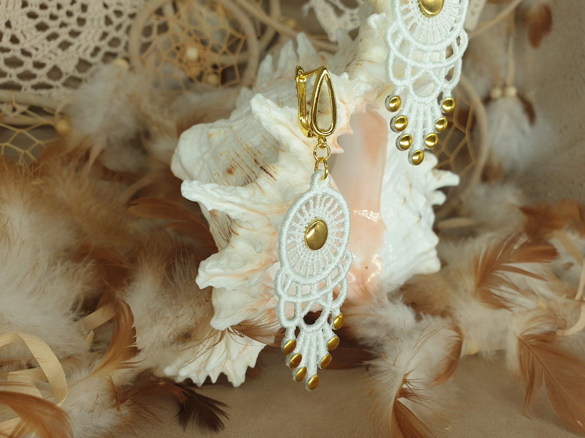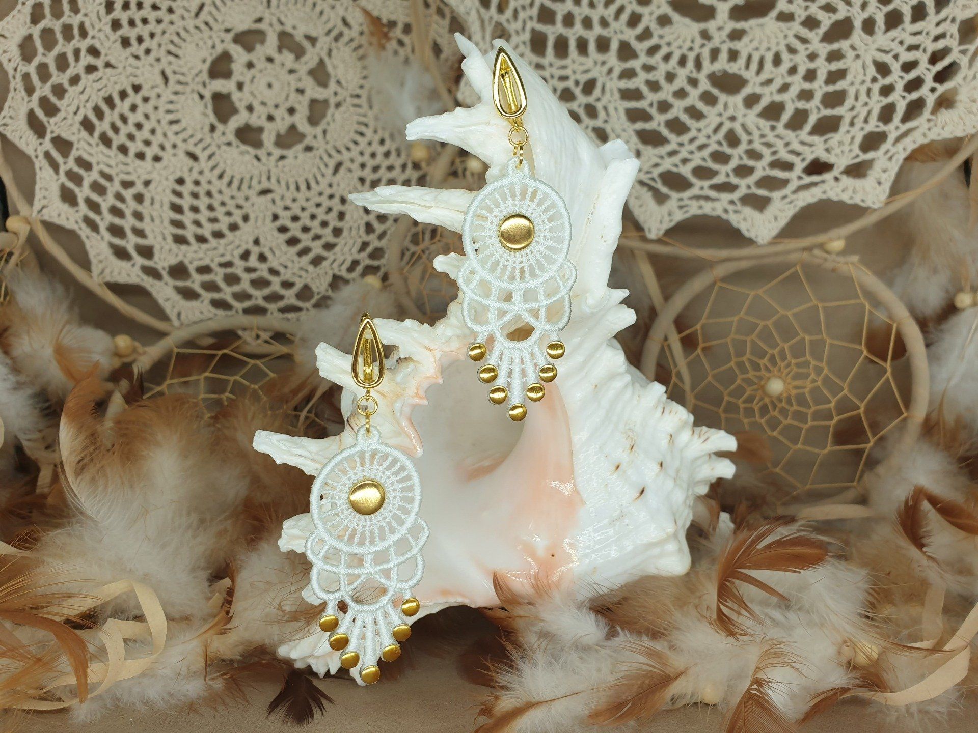 Diese filigranen Ohrringe sind im Free-Standing-Lace-Verfahren mit hochwertigem Polyestergarn gestickt,