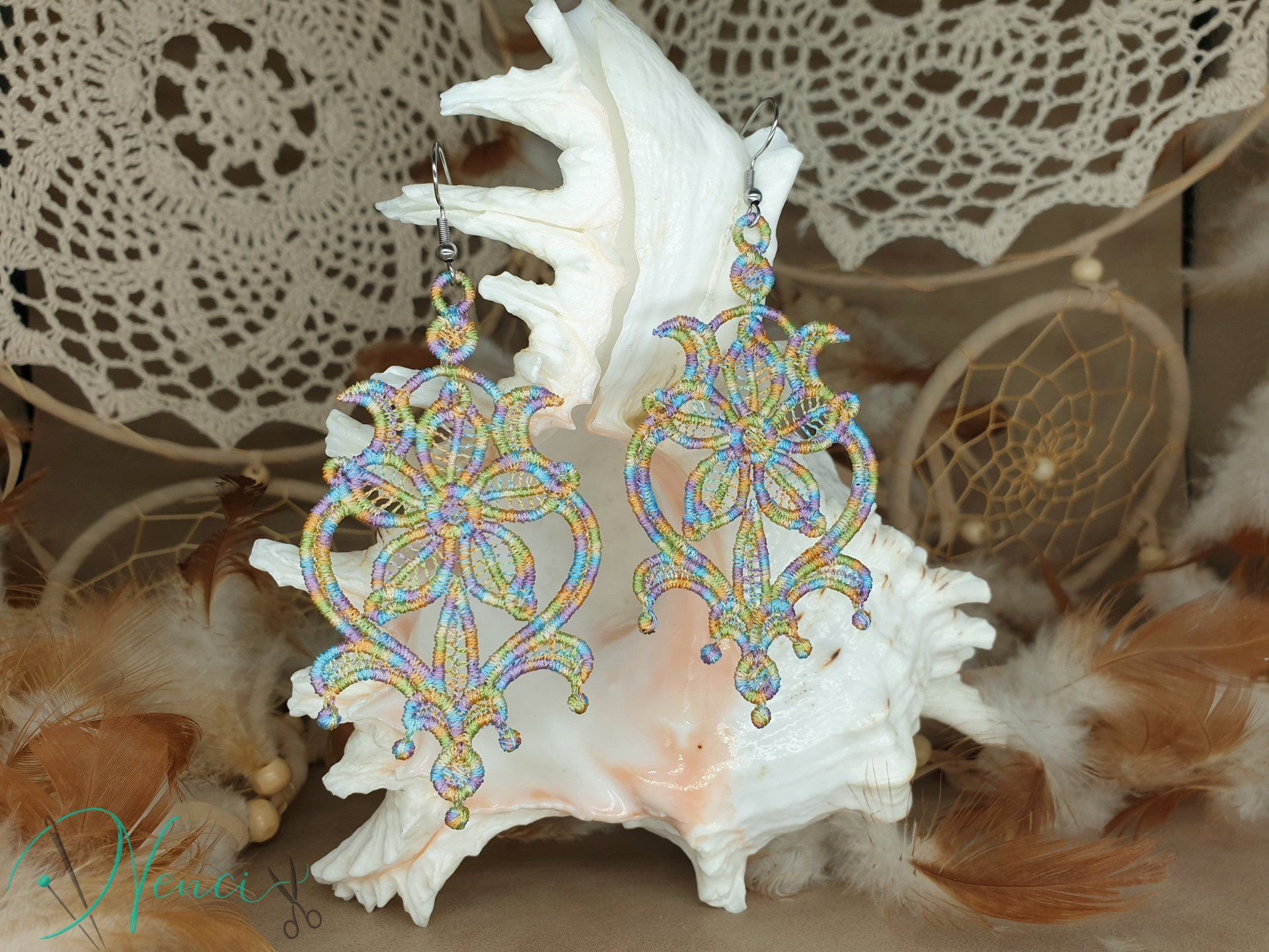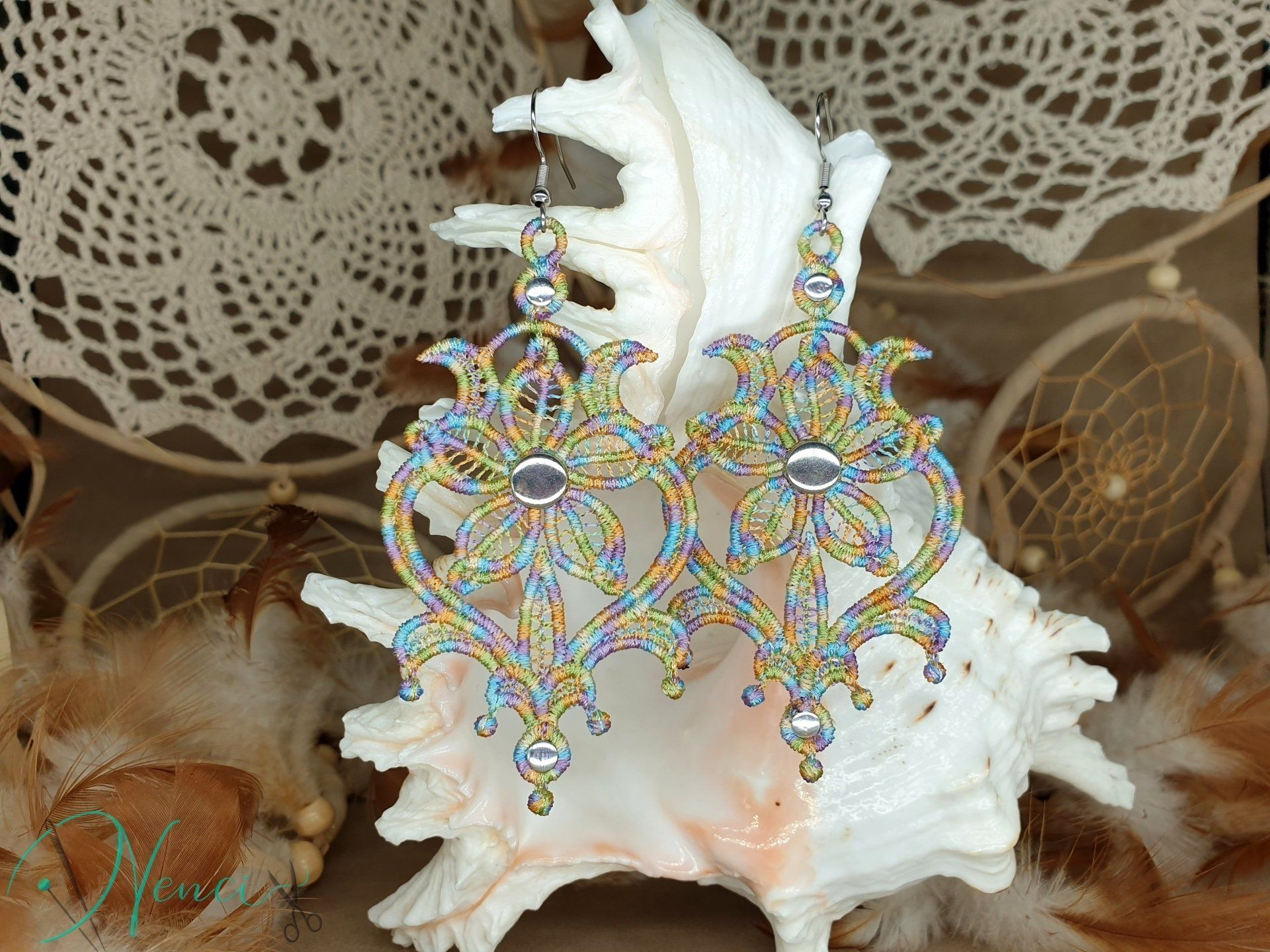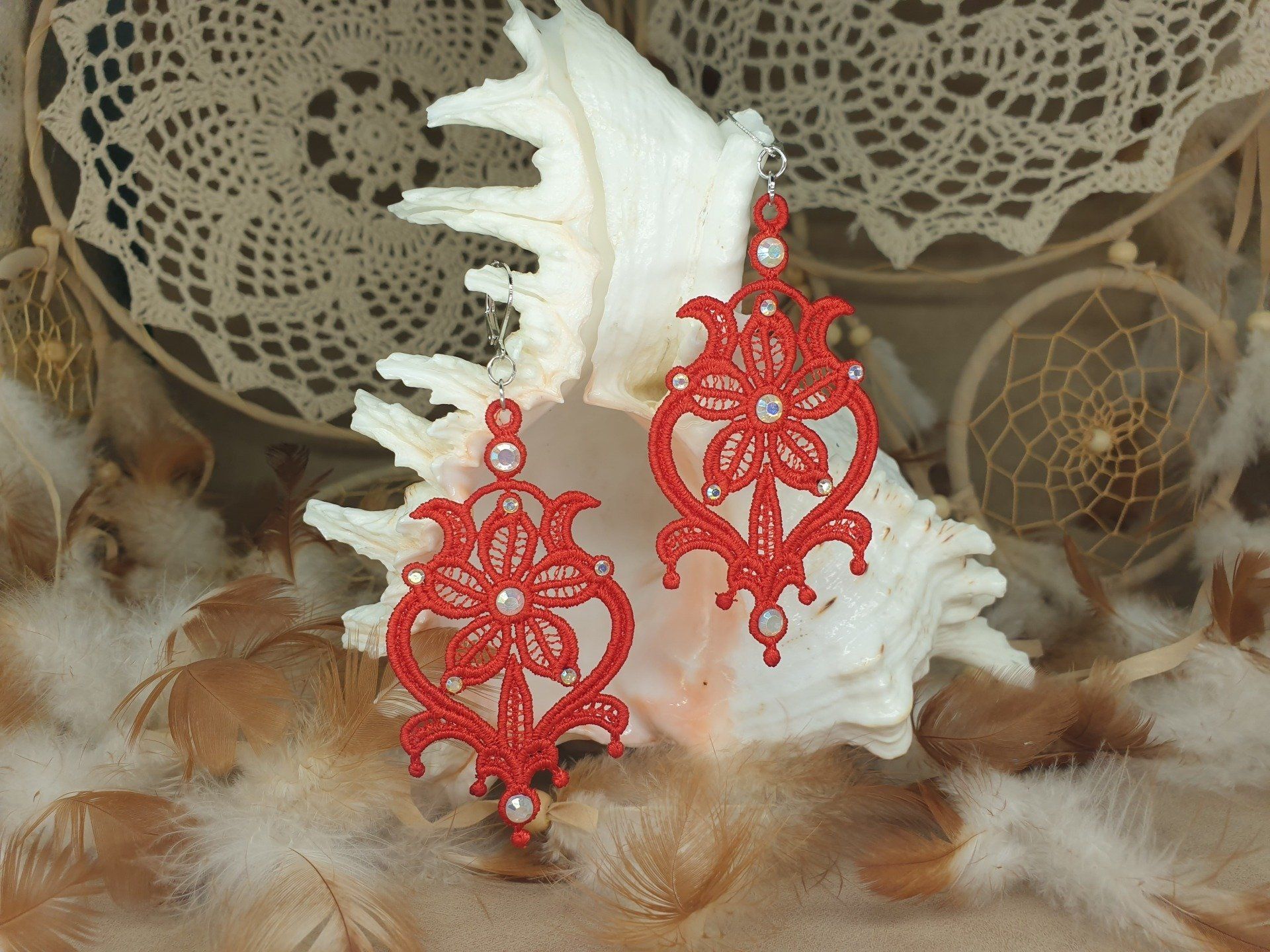 Diese Ohrringe sind im Free-Standing-Lace-Verfahren mit hochwertigem Polyestergarn gestickt,