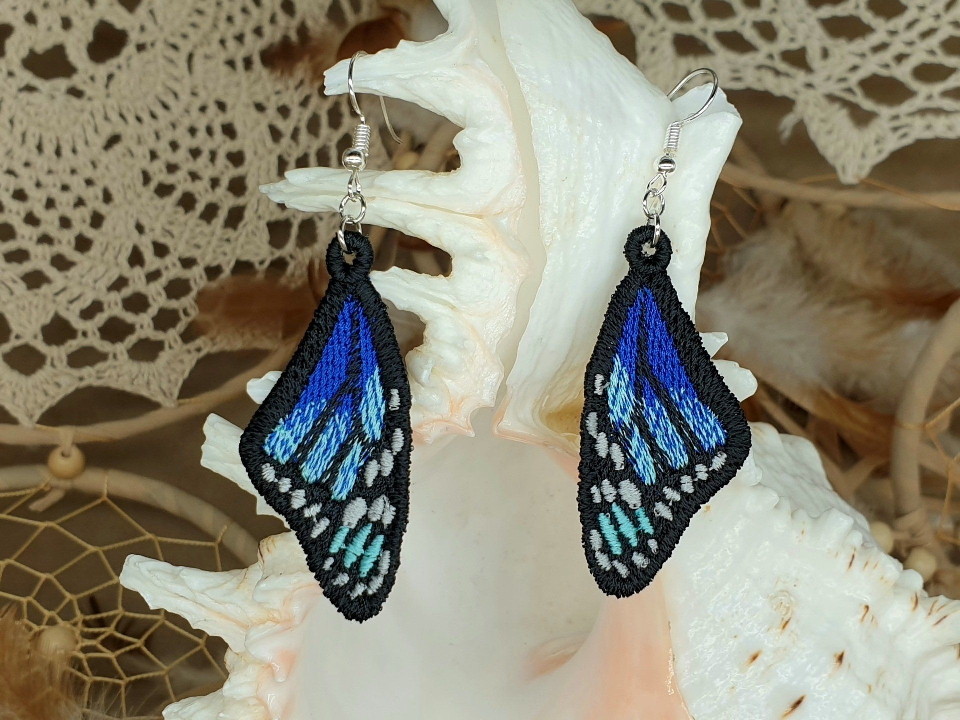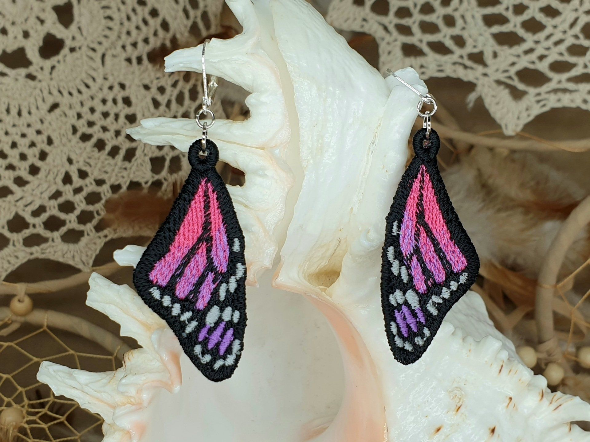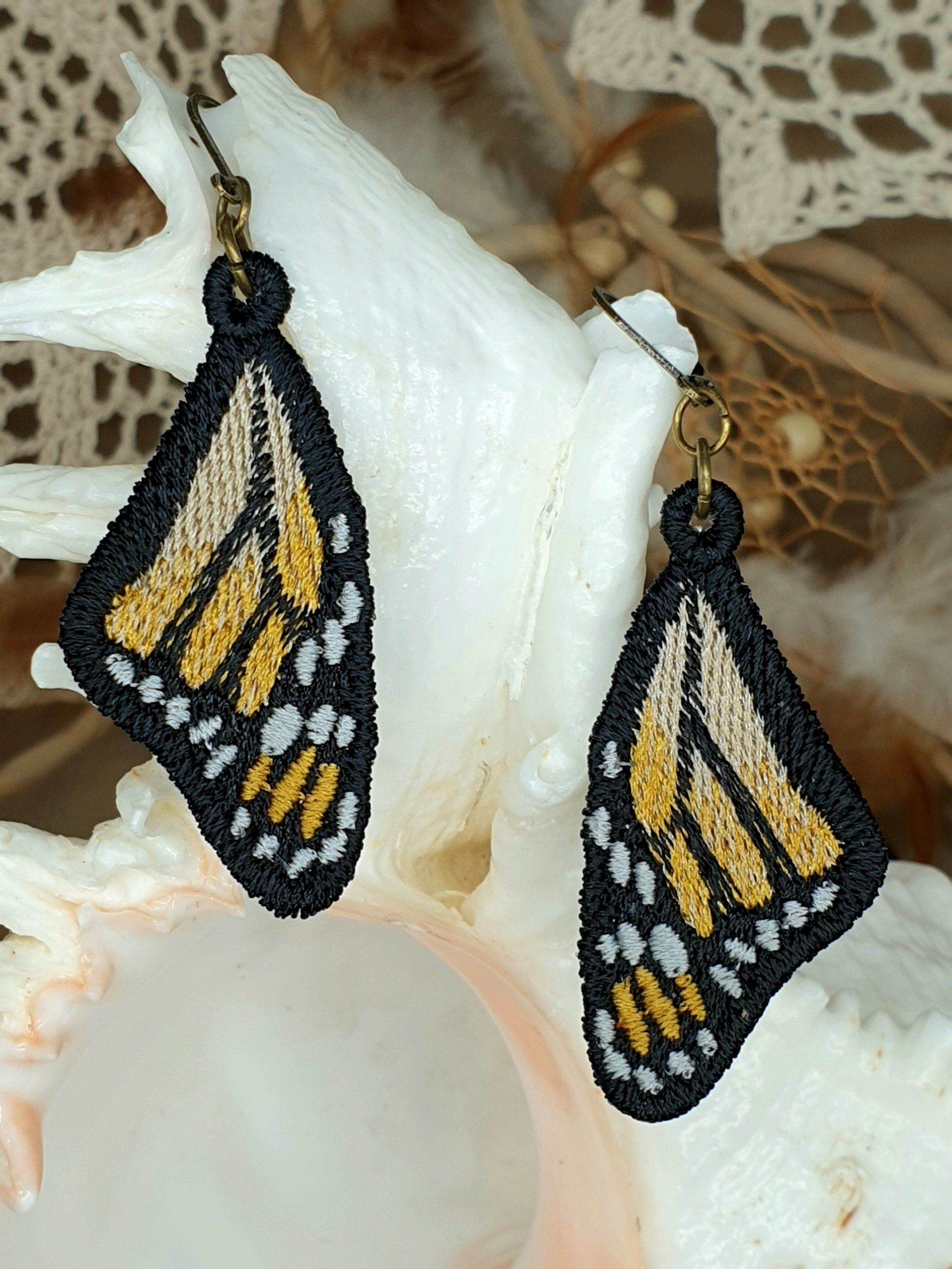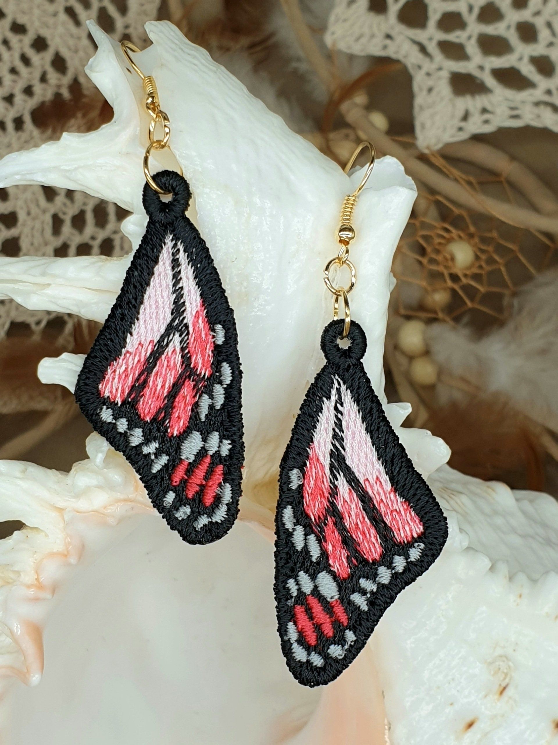 Diese Ohrringe sind im Free-Standing-Lace-Verfahren mit hochwertigem Polyestergarn gestickt,