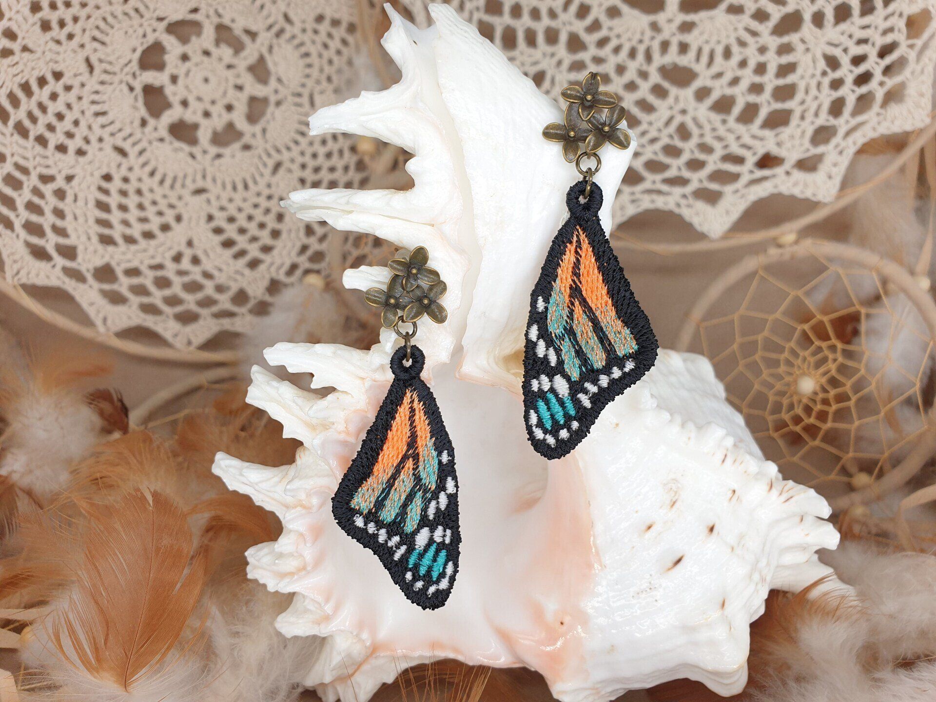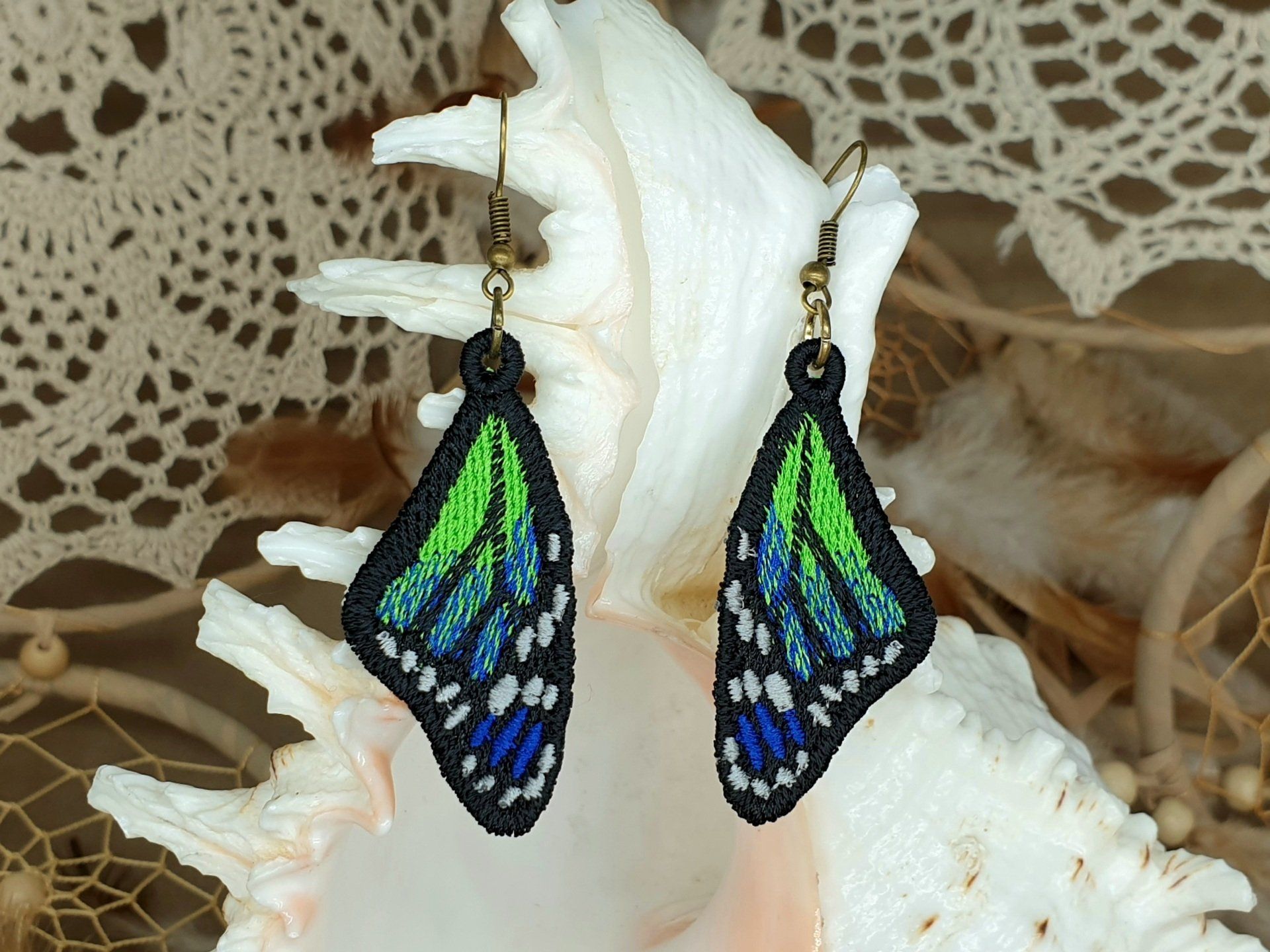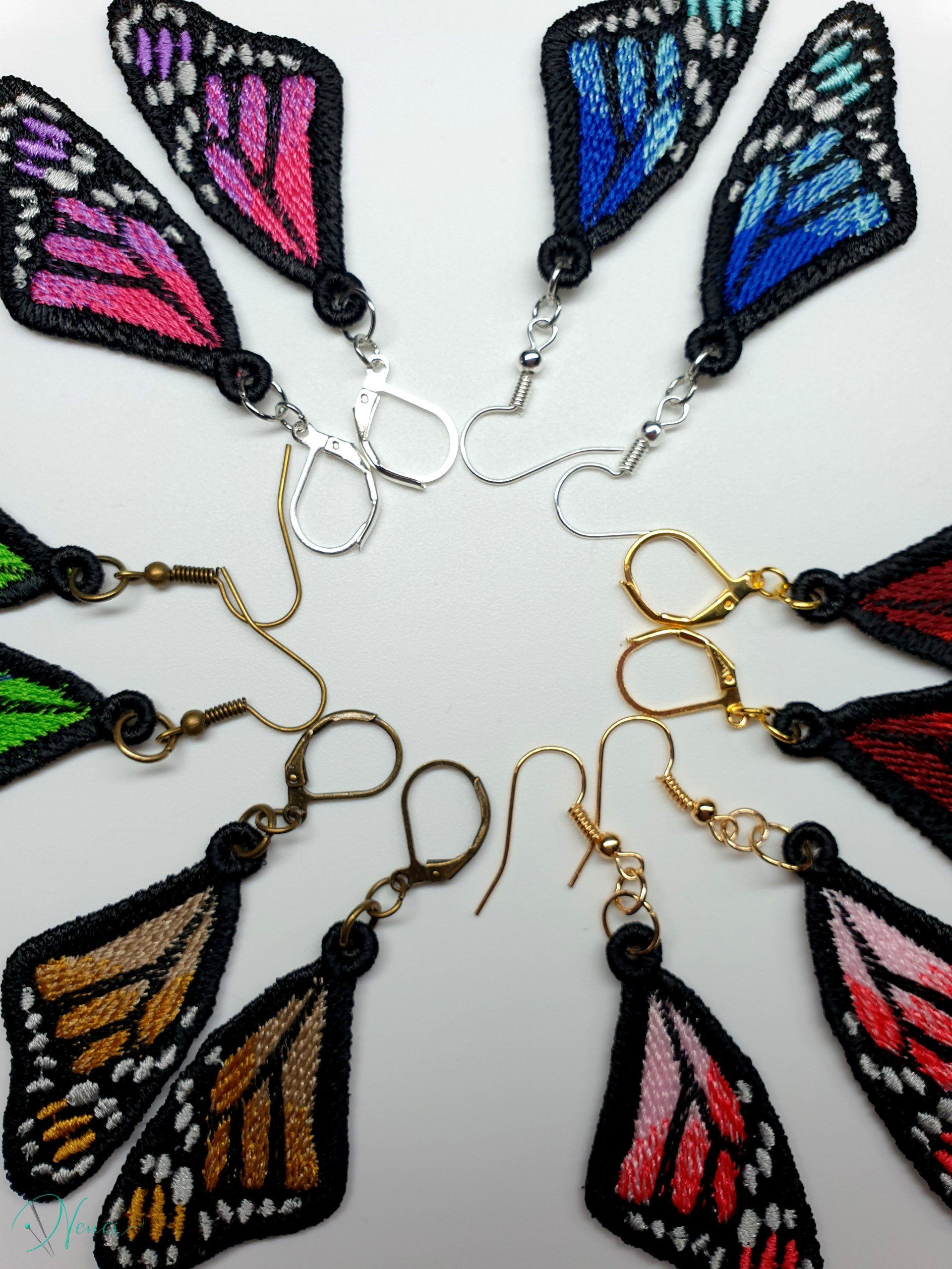Diese Ohrringe sind im Free-Standing-Lace-Verfahren mit hochwertigem Polyestergarn gestickt,