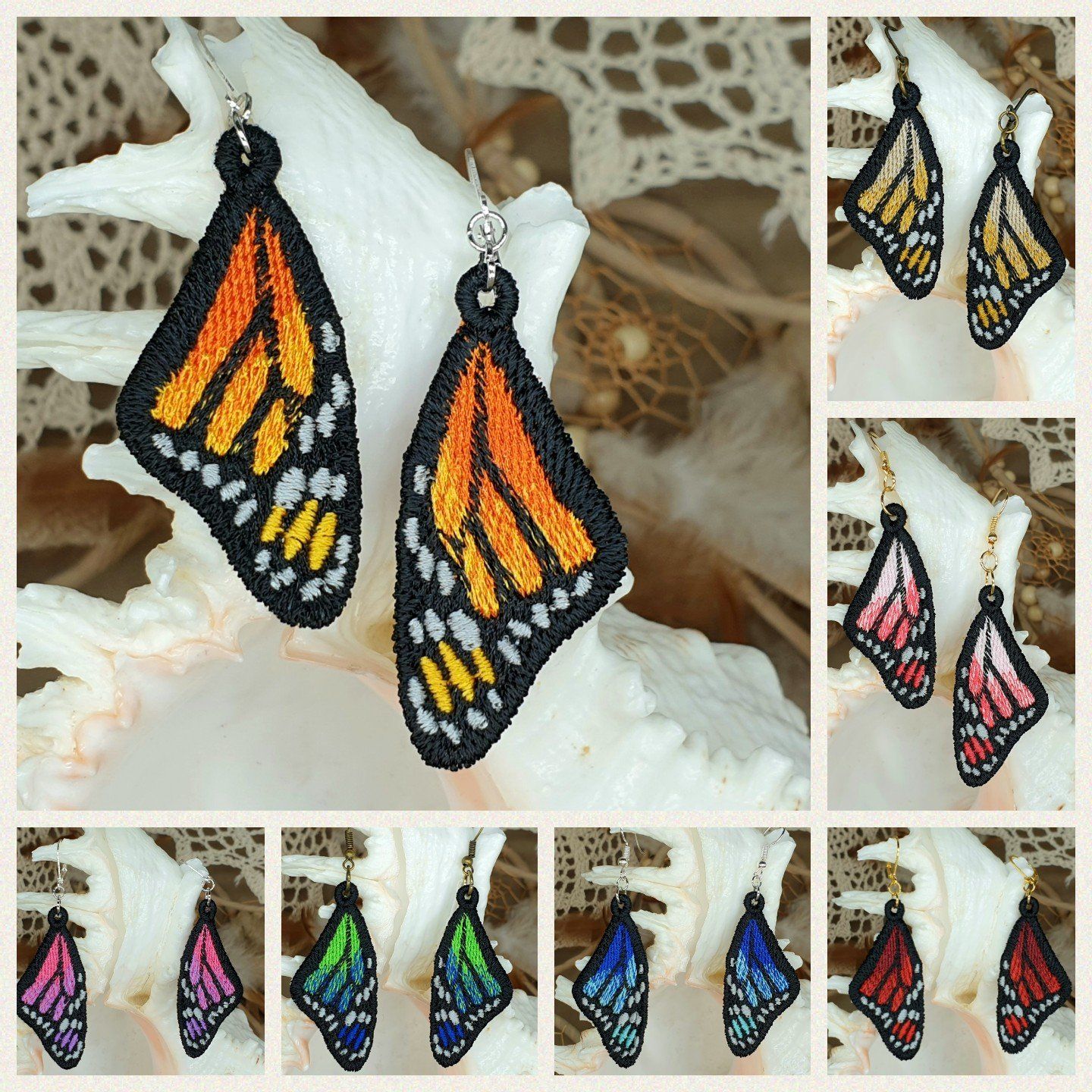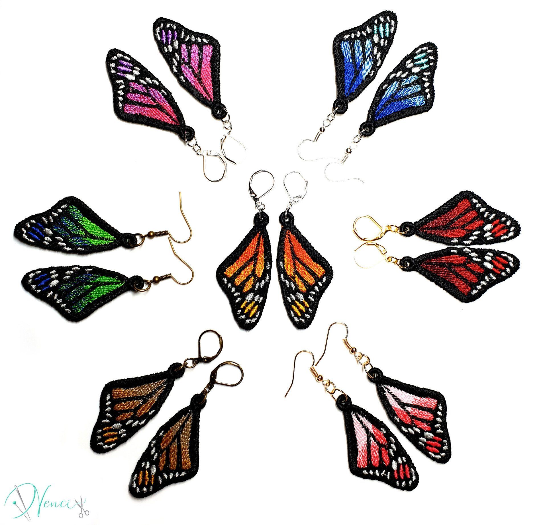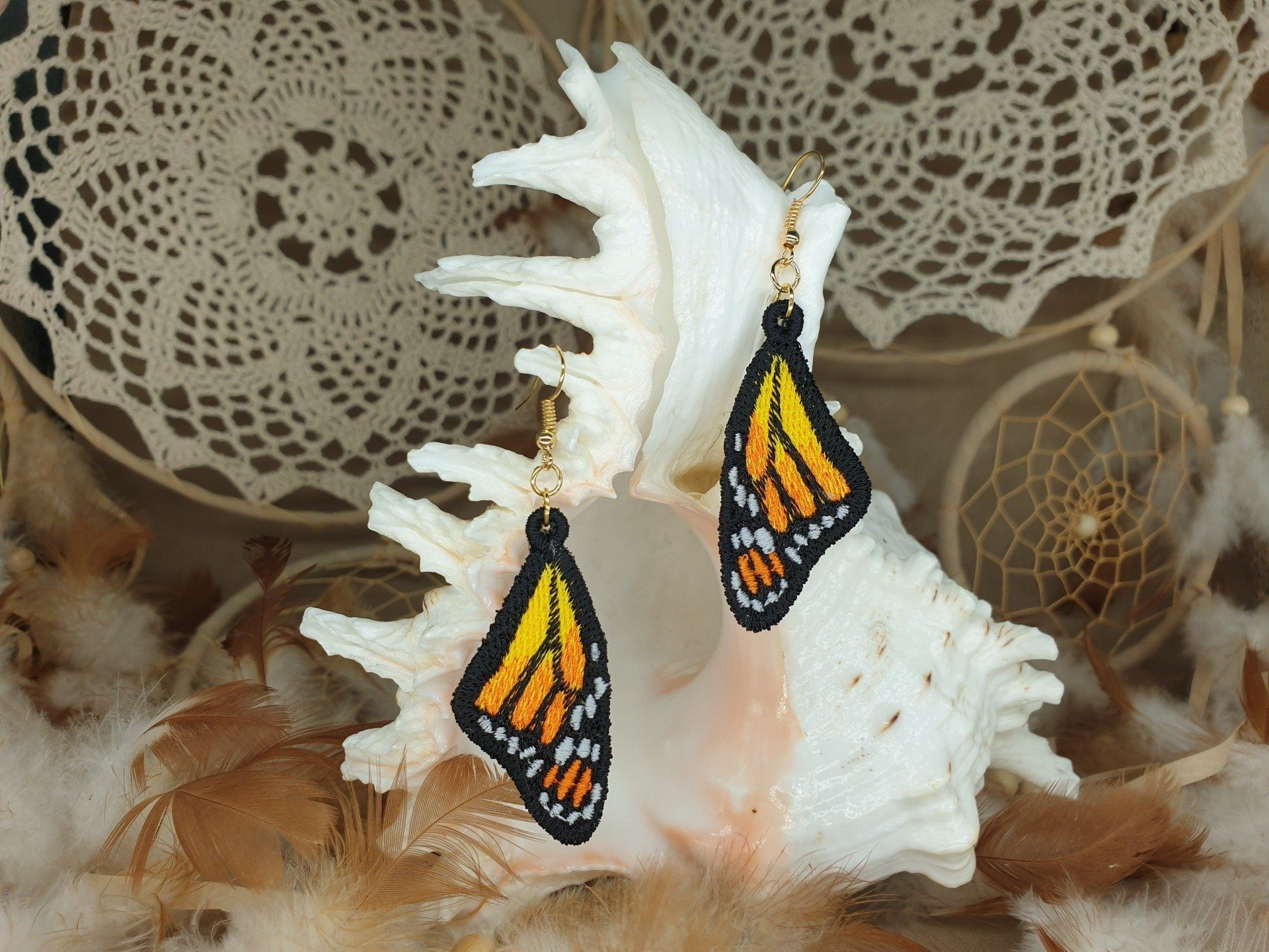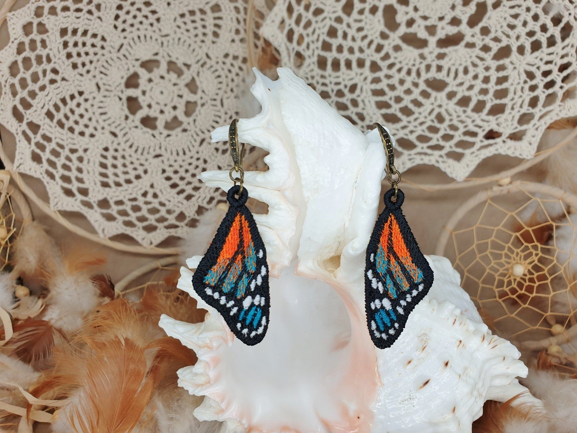 Diese Ohrringe sind im Free-Standing-Lace-Verfahren mit hochwertigem Polyestergarn gestickt,