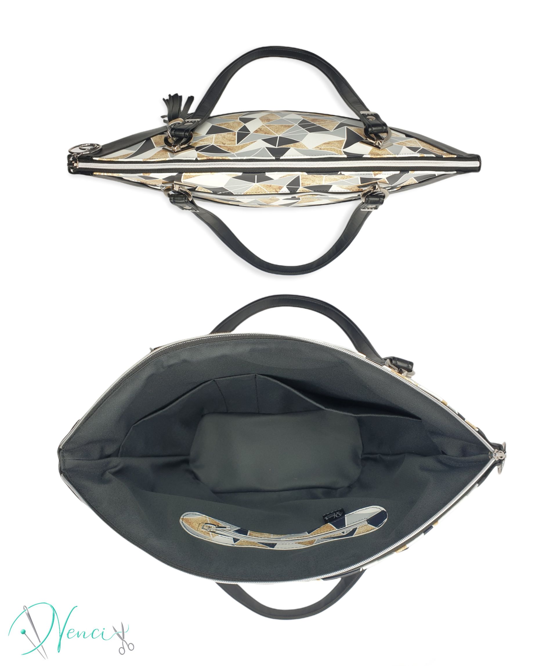 Außen findest du glattes schwarzes Kunstleder und mittig geometrisches gedrucktes Kunstleder. Selbst die Aufhängung ist geometrisch!