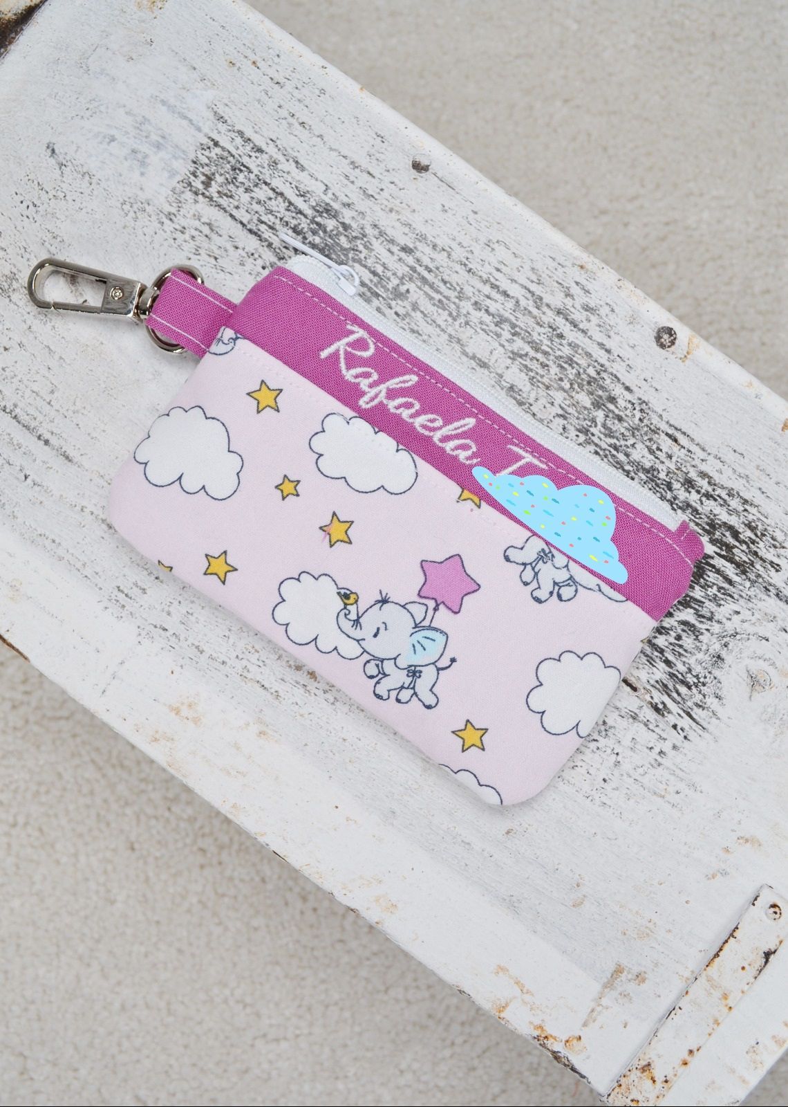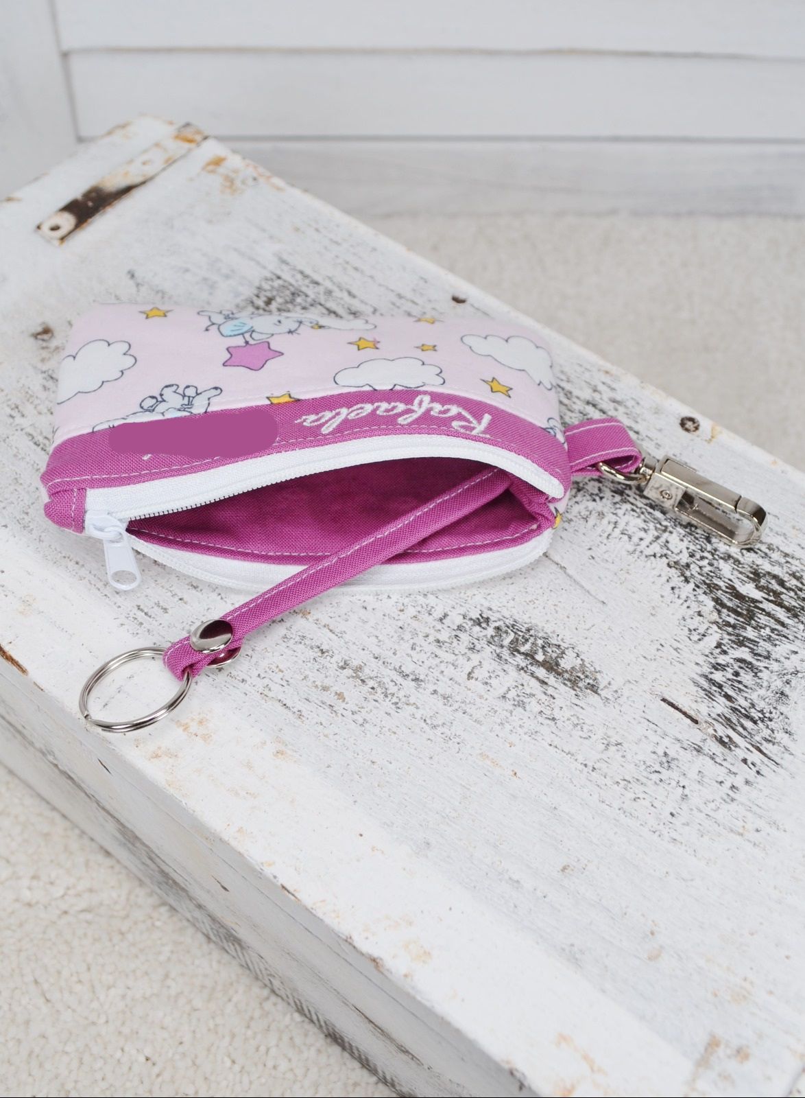 Praktisch ist der Karabiner, mit dem du das Täschchen einfach an oder in deine Handtasche oder an deine Hose einhängen kannst, innen befindet sich (kann auch weggelassen werden) ein angenähter Schlüsselring, damit dein Schlüssel nicht herausfällt beim Öffnen.