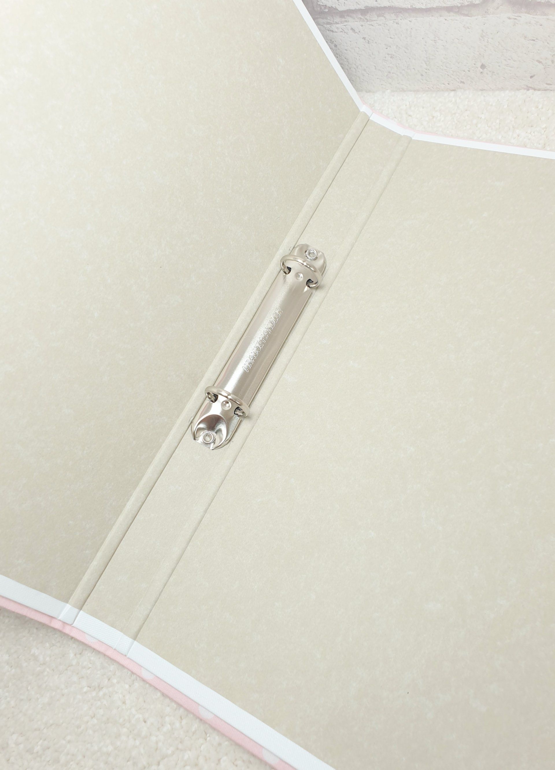 Die Zeugnismappe besteht aus einem weißen DinA4 Ordner mit 2-Ring-Mechanik und der passenden Hülle aus Baumwollstoff.