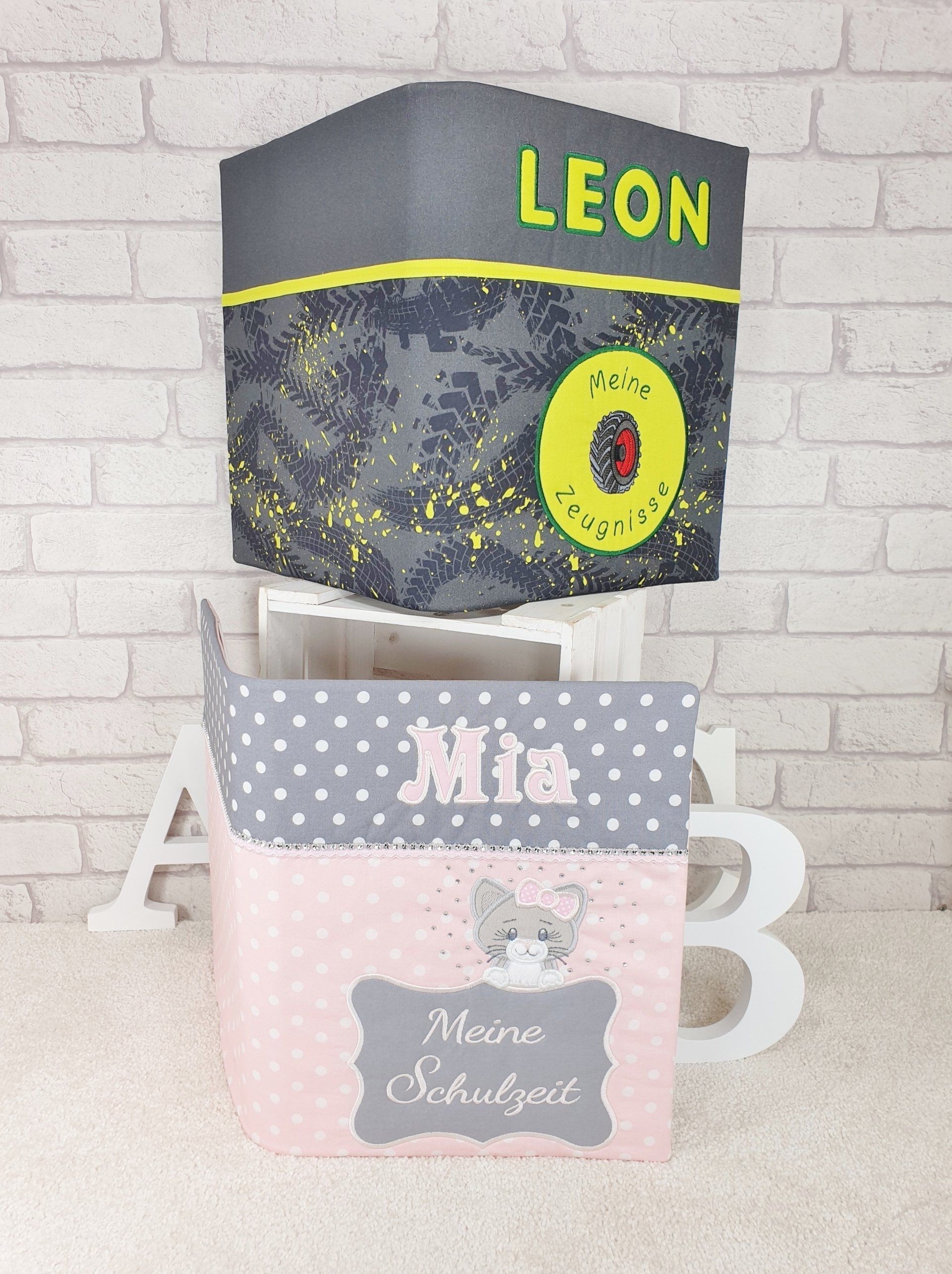 Oben wird der Name im gleichen Stil wie auf der Schultüte gestickt und unten ein passendes Motiv und/oder ein Spruch wie "Zeugnismappe", "Meine Zeugnisse", "Erinnerungen an die Schulzeit".